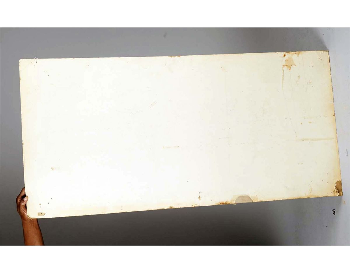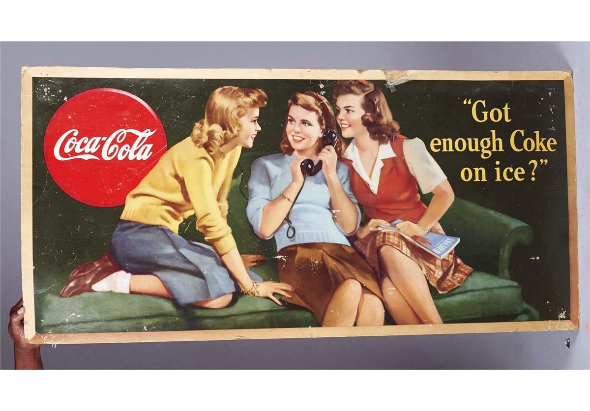 Long ad sign has slogan of "Got Enough Coke on Ice" , printed by Edwards & Deutsch of Chicago. Images shows three teen girls planning a party over the telephone, circa 1945. Condition (Good). Size 27" x 56"