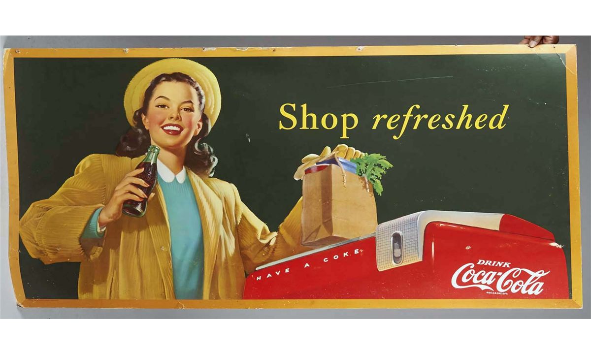 Long printed sign showing a young brunette woman, circa 1948. Condition (Very good). Size 27" x 56"