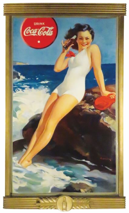 Coca Cola Cardboard Poster in Original Frame. Depicting Bathing Beauty. Lithographed in Canada. Repair bottom left corner, price residue sticker top left conrer and a few surface scratches otherwise good condition. 33 X 56 inches overall.
