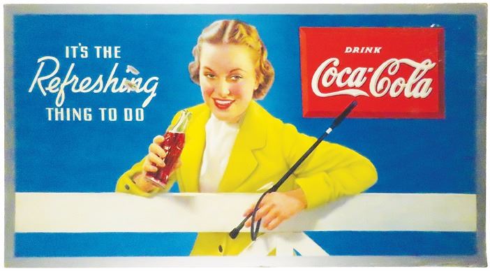 Coca Cola Cardboard Poster. Depicting equestrian gal in yellow jacket. Two holes in "Refreshing", rubs at top right corner and edgewear. 44 1/2 X 23 1/2 inches.