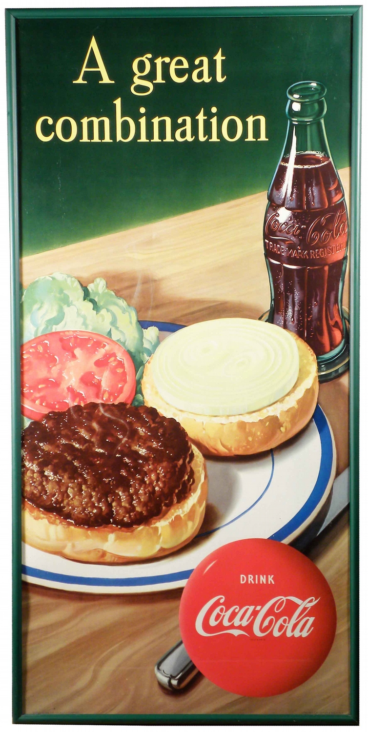 1950 Coca Cola Cardboard Sign, A Great Combination. Framed under glass. Excellent condition. 22 X 45 inches.