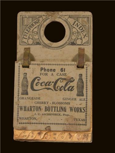 Coca Cola Cardboard Telephone Index, extremely early Wharton Bottling Works, Wharton, TX. Minor cardboard loss at 12:00 and staining throughout. 3 1/2 X 6 inches.