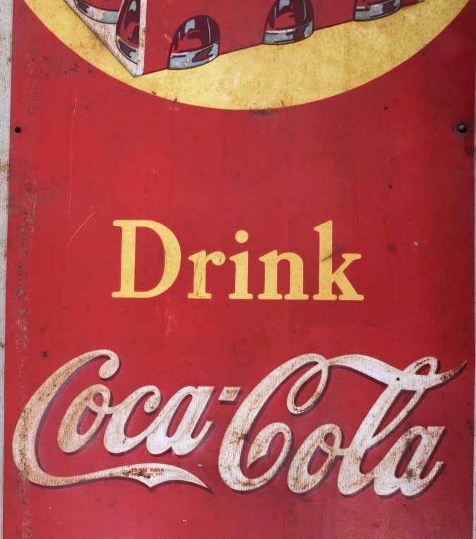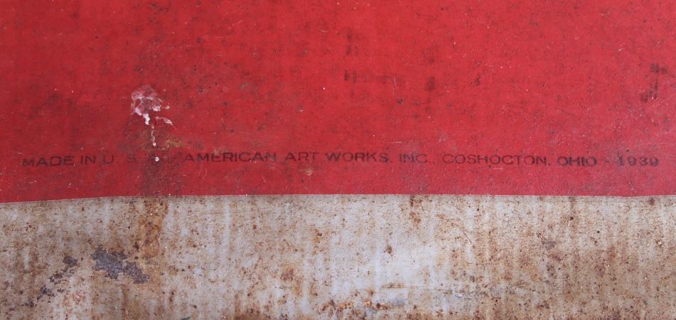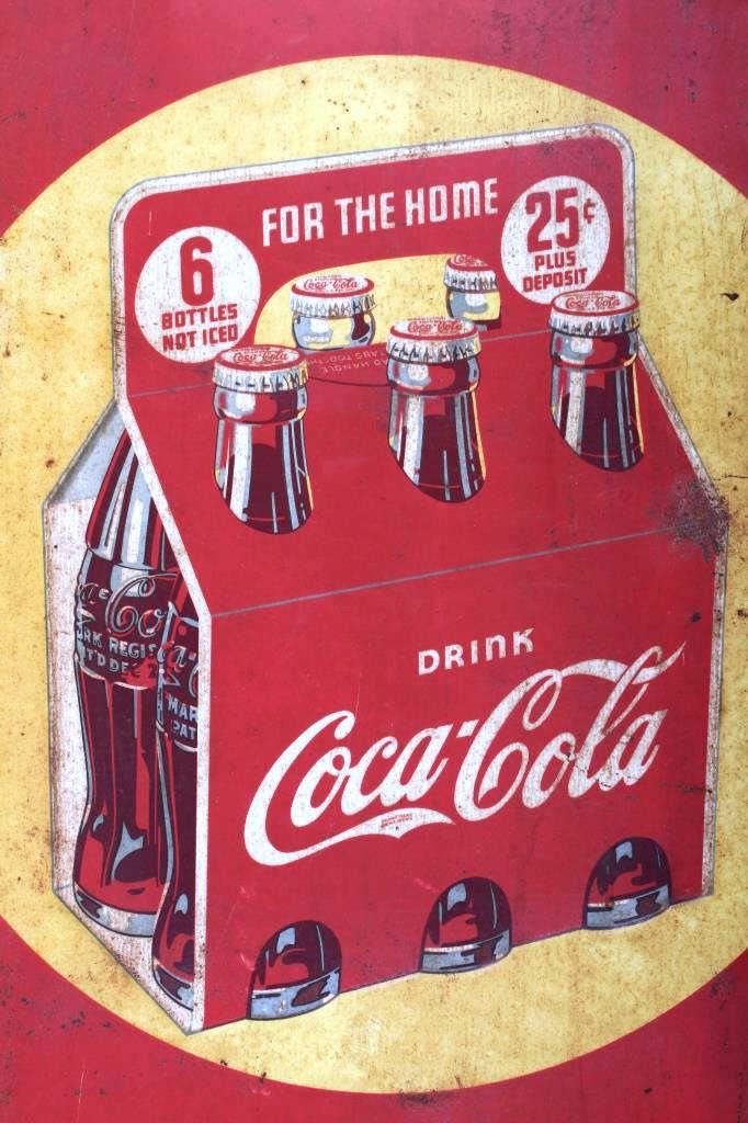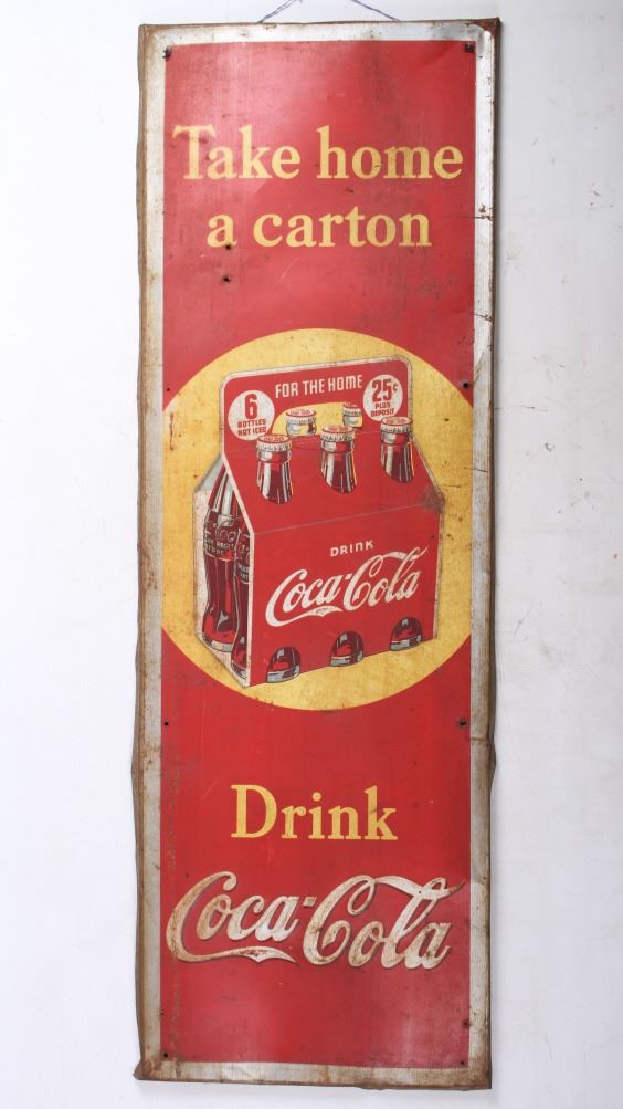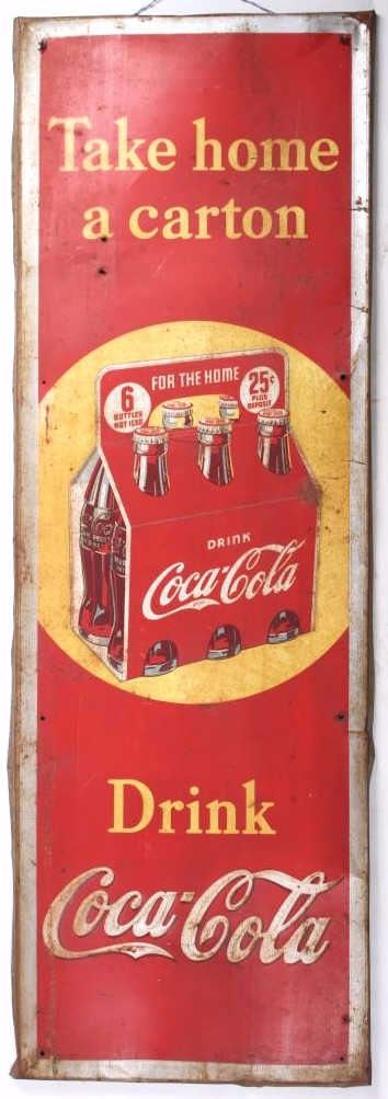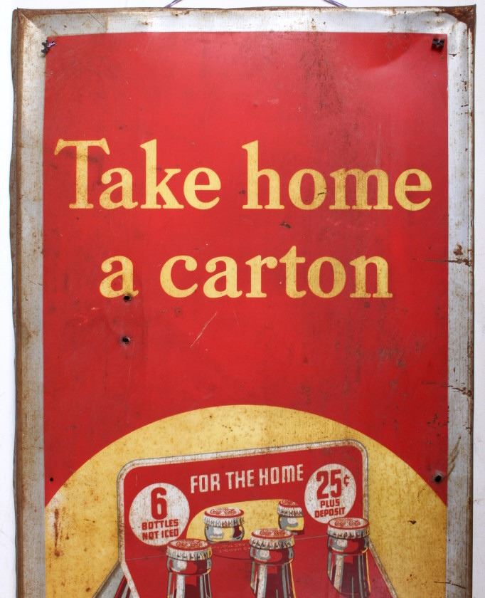 This is an original Coca-Cola Carton six pack of glass bottles embossed tin sign from circa 1938. The sign is made in the USA by American Art Works Inc. Coschocton, Ohio 1938. Also marked 12-38-B. The sign shows some signs of age, but overall is a great Montana mercantile Coca-Cola soda-fountain advertising. Measures "H x "W.