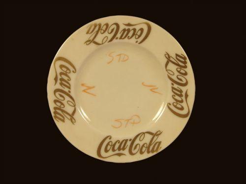 Coca Cola Ceramic Plate, Refresh Yourself, bottle/glass with logo on top, 7 1/4 inch dia and printers proof plate with 4 different logos, showing standard and new gold color, extremely rare, 6 1/4 inch dia. No chips or cracks.