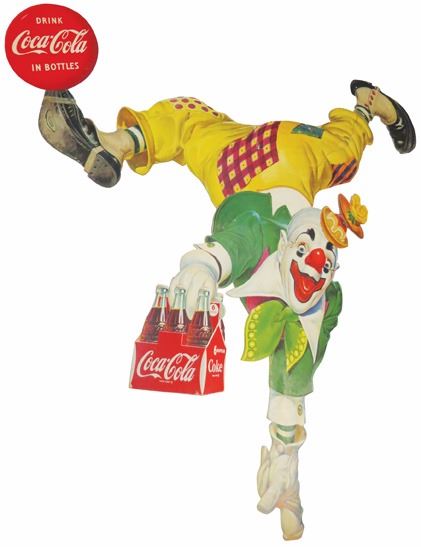 Coca Cola Clown Die Cut Cardboard Store Display Sign. Advertising 6 packs. Different version than Lot #554. A few creases and edgeware otherwise good condition. Approx. 48 1/2 X 55 Inches.