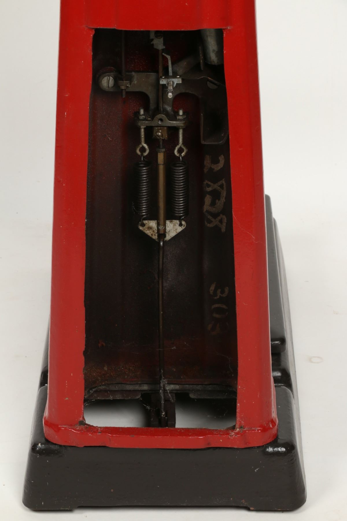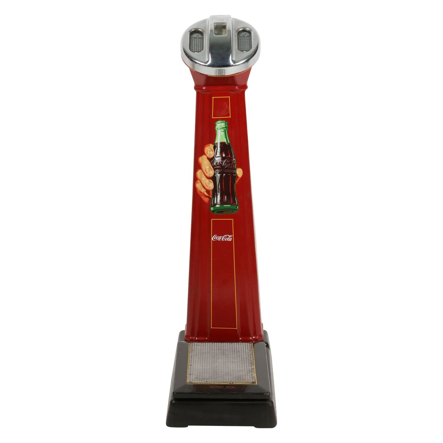 Standard Computing Scale Co. Detroit, Michigan. 40.5" x 20" x 10.5". Restored and functional. Chrome accents exhibit minor, uniform wear. Painted to Coca-Cola theme. Retains original back plate and decal. $600-800.