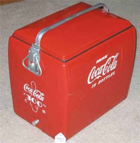 Original 1950's Coca Cola Cooler. Premium presented for a "300" Bowling score, with motif. Not a repro, not refinished, only minor paint chips. Orig insert, handles, release valve. Condition: outstanding. 16.5"tx13"dx17.5"l. 20lbs. (5-117)