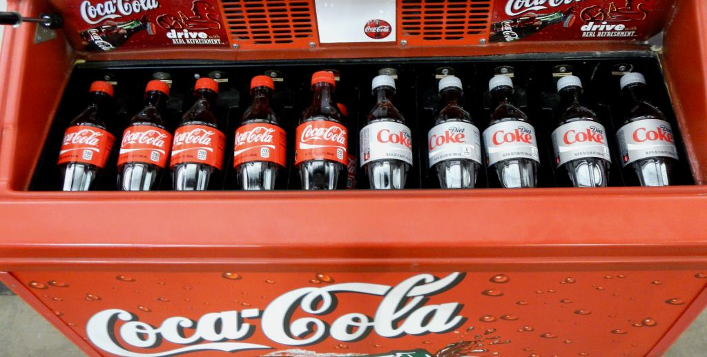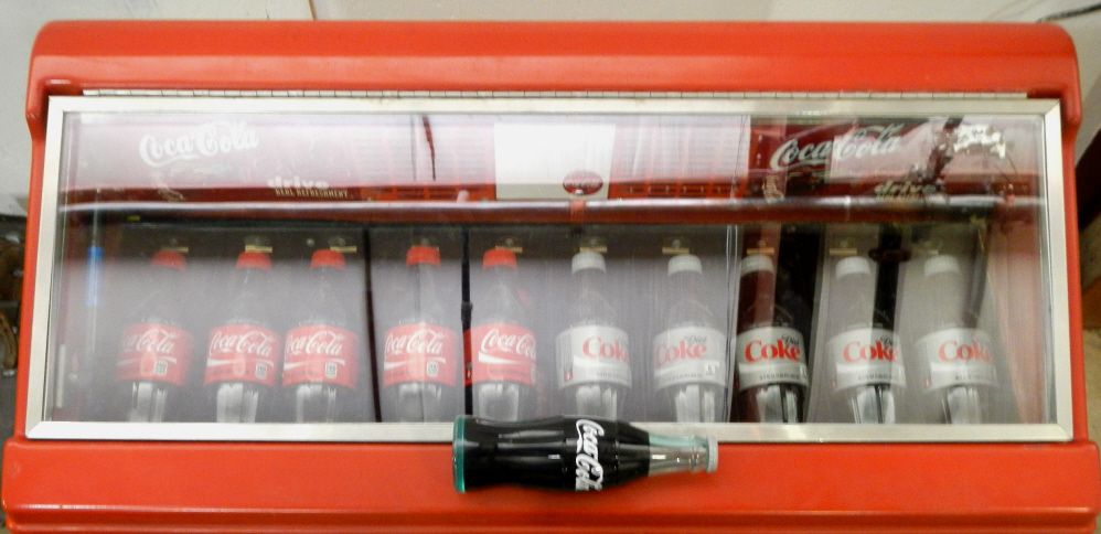 This is a great Coke Cooler that takes bottles 10 bottles across and bottles all the way to the bottom. This is a modern Cooler and works great! Has no problems and keeps the beverage cool. Great for a garage or 'Man Cave'. The top features a thick glass door with a coke bottle handle. Coca-Cola Refrigerator holds 100 20oz BOTTLE OF COKE, SPRITE, DIET COKE, ETC..