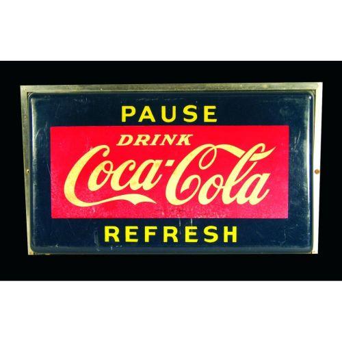 Coca Cola Counter Top Light Up Sign, early, Pause and Refresh. Hanover Neon. Some discoloration otherwise good condition. 17 X 10 1/2 X 2 1/2 inches.