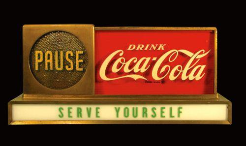 Coca Cola Countertop Light Up Sign, Pause Serve Yourself. Good original working condition. 19 1/2 X 9 inches.