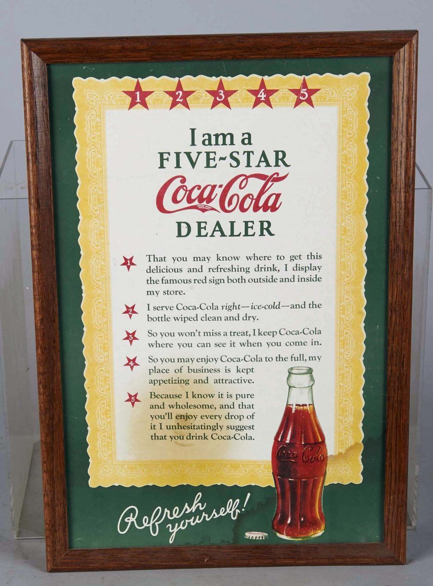In Frame circa 1930s, "I Am A Five Star Coca-Cola Dealer". Condition (Very good). Size 13" x 19"