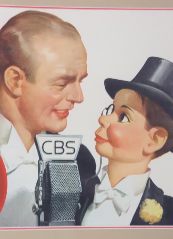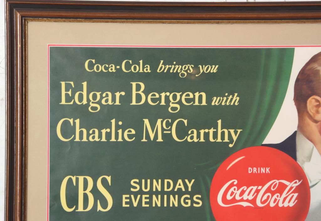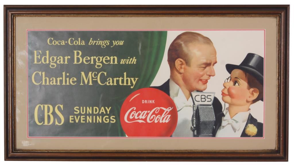Coca-Cola, Edgar Bergen & Charlie McCarthy Advertisement. Printed litho advertisement with the scene of Edgar Bergen and ventriloquist dummy in front of a CBS microphone. Reads “Coca-Cola brings you Edgar Bergen with Charlie McCarthy, CBS Sunday Evenings”. In very good condition, framed and has good bright color, no rips, tears or folding. 10 in. high x 22.5 in. wide.