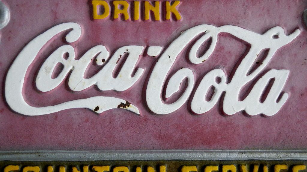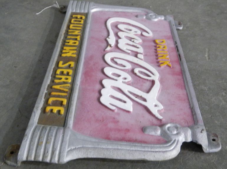 Coca-Cola "Fountain Service" Cast Iron Sign - This piece is Soda Advertisement for Coca-Cola. The sign is made with cast iron and is all hand painted. It is a thought to be for the back rest of a park bench. Measures 12.5"x20"