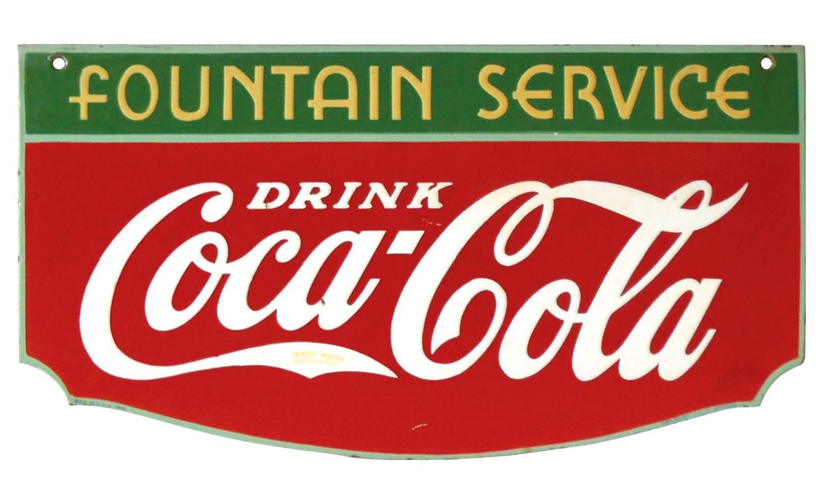 Coca-Cola Fountain Service sign, 2-sided diecut porcelain, c.1934, mfgd by Tenn. Enamel Mfg. Co.-Nashville, a Rare sign in Exc cond on both sides, 14"H x 27"W.