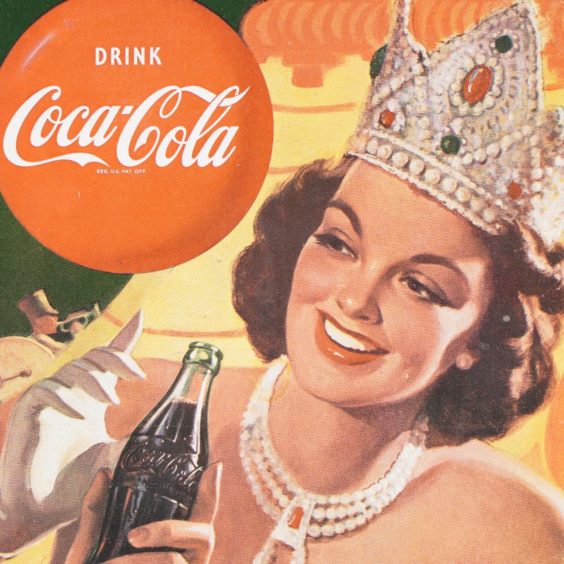 Colorful Coca-Cola advertising print featuring a glamorous woman in a crown enjoying a glass bottle of Coca-Cola, with the slogan Refresh… add zest. Presented under glass in a decorative silver-tone frame. A bright and nostalgic piece of Coca-Cola promotional art.