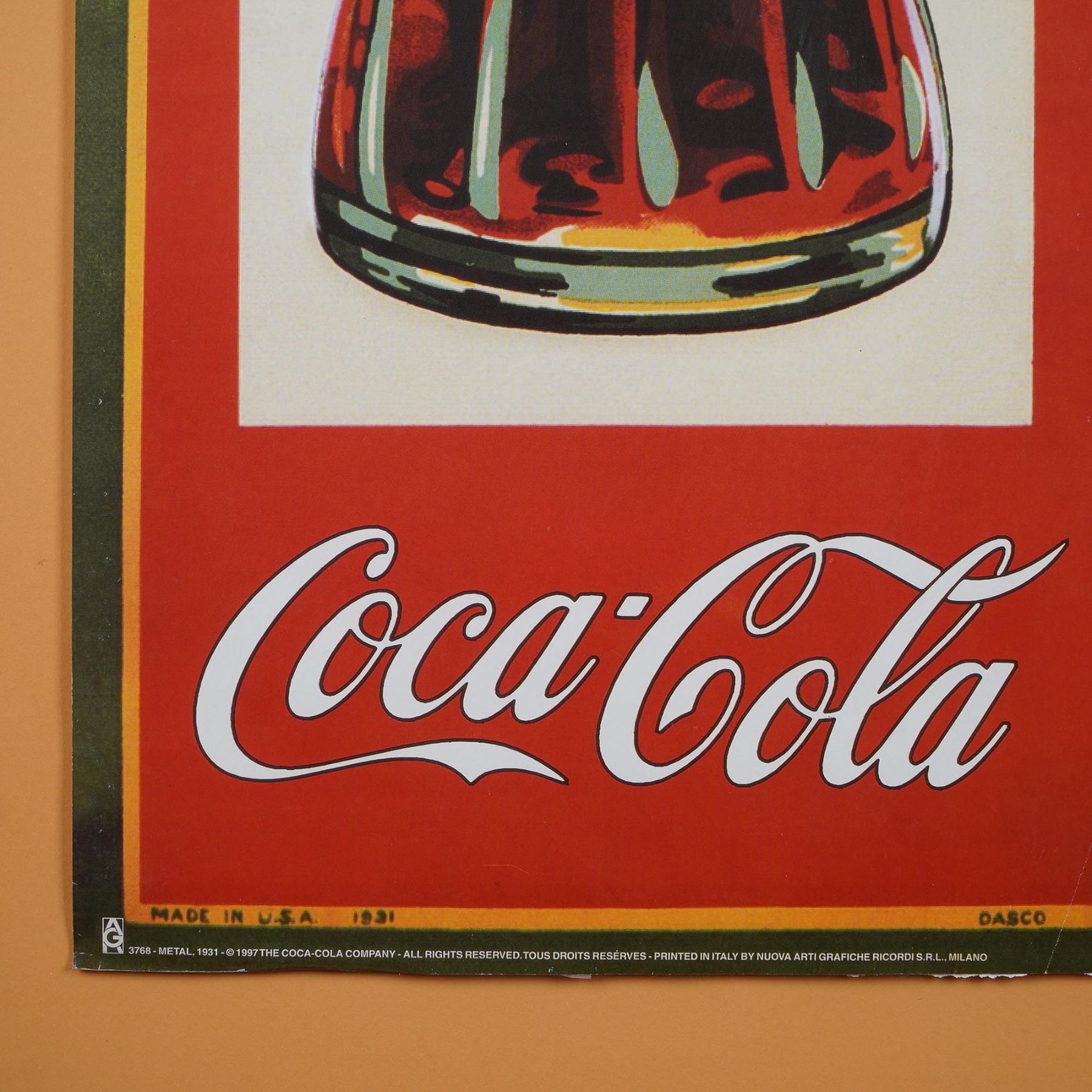 Framed Coca-Cola advertising print depicting the iconic contour bottle with “Drink Coca-Cola” text, based on the original 1931 design. Printed in Italy by Nuova Arti Grafiche Ricordi and released by The Coca-Cola Company in 1997. Presented in a wood frame under glass. Measures approximately 43 inches high and 18.5 inches wide.