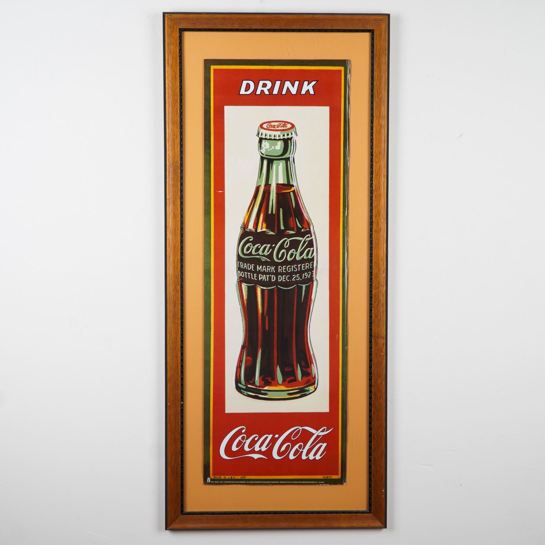 Framed Coca-Cola advertising print depicting the iconic contour bottle with Drink Coca-Cola text, based on the original 1931 design. Printed in Italy by Nuova Arti Grafiche Ricordi and released by The Coca-Cola Company in 1997. Presented in a wood frame under glass. Measures approximately 43 inches high and 18.5 inches wide.