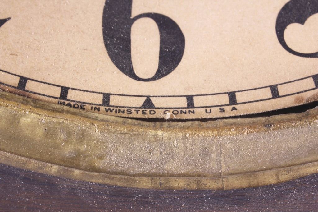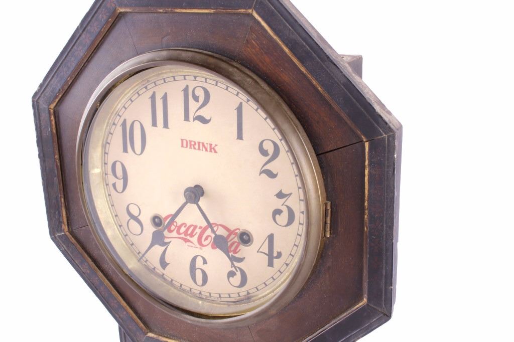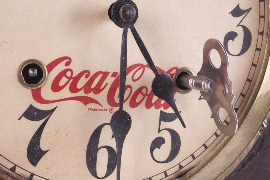 Offered for bidding is what is presumed to be a early to mid century, Gilbert Coca-Cola pendulum clock. other than the "Coca-Cola" branding and glass etching, the only markings on the clock state "Made in Winsted Conn. U.S.A.". The clock housed in a wooden case, has two glass doors, the top one being framed in a metal ring, which seems to be missing a mounting tab. The clock is not currently in operating condition, but is in good aesthetic condition. It measures to 21 7/8" tall and 12 1/4" wide.