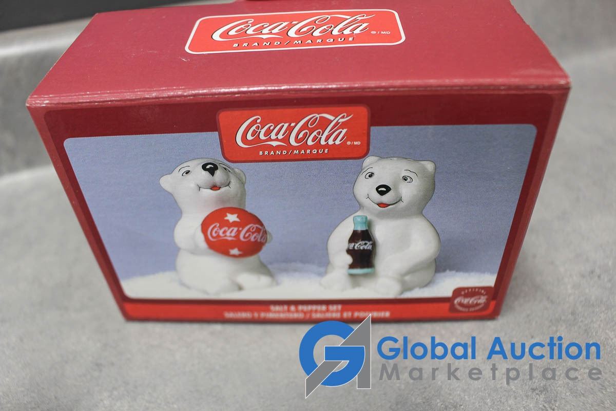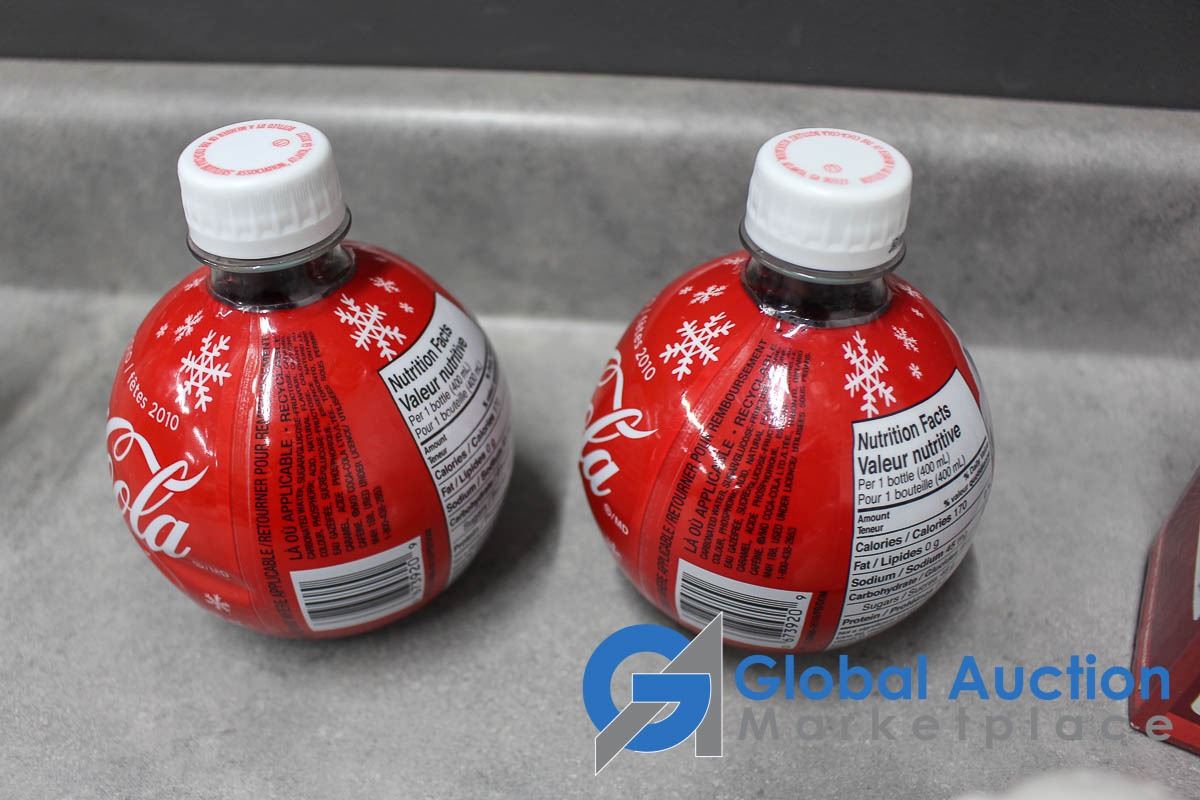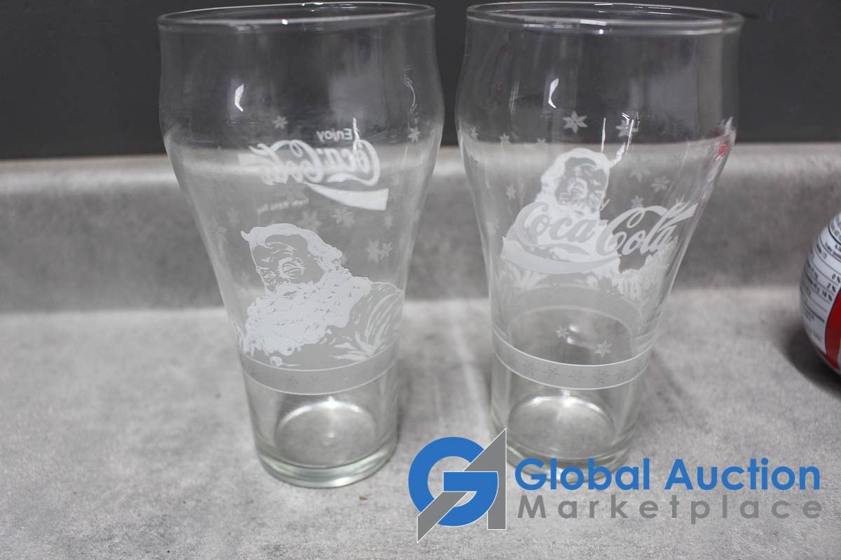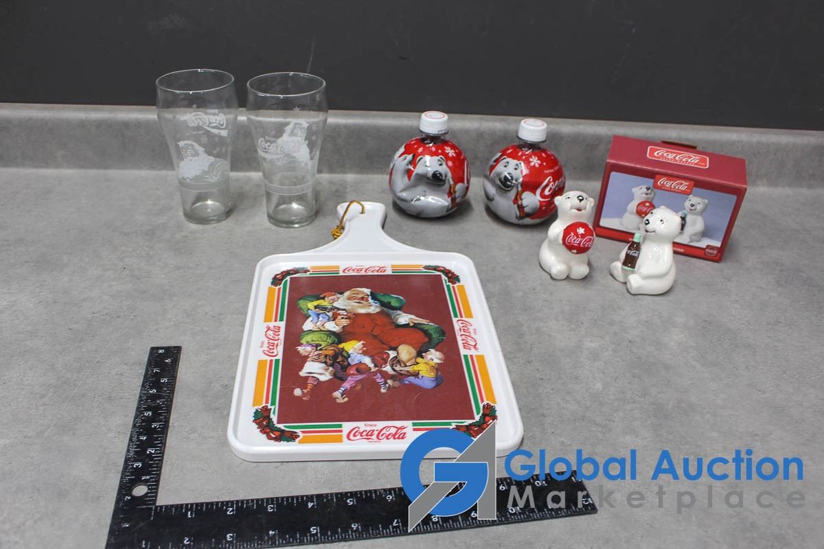 (2) Santa Coca Cola Glasses; (2) Bottles Coca Cola Holiday 2010 Balls w/Contents; Coca Cola Polar Bears Salt & Pepper Set; Santa Clause Coca Cola Cutting Board