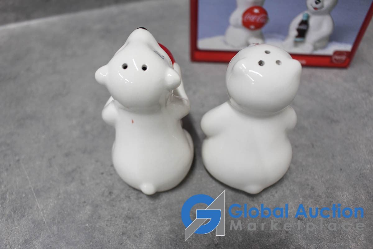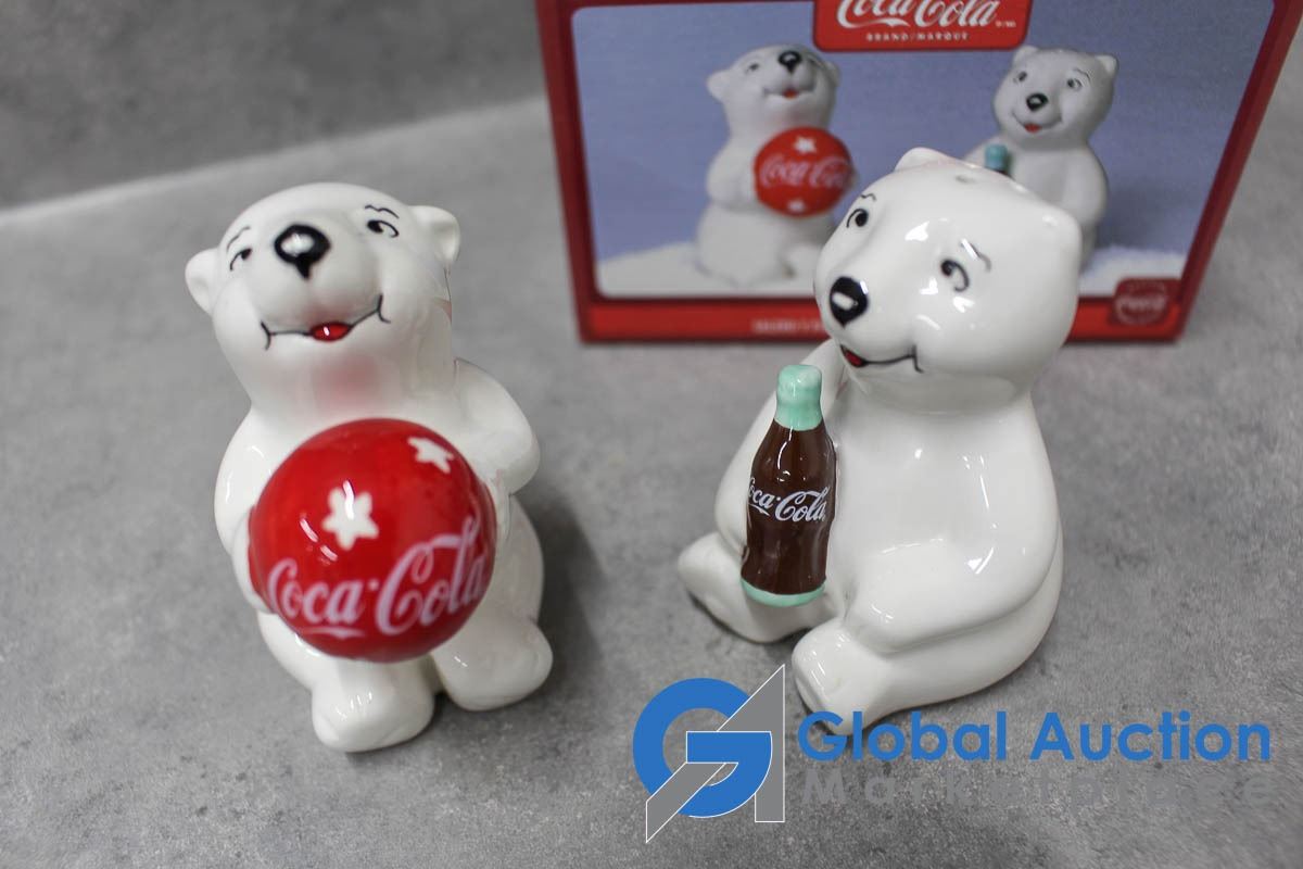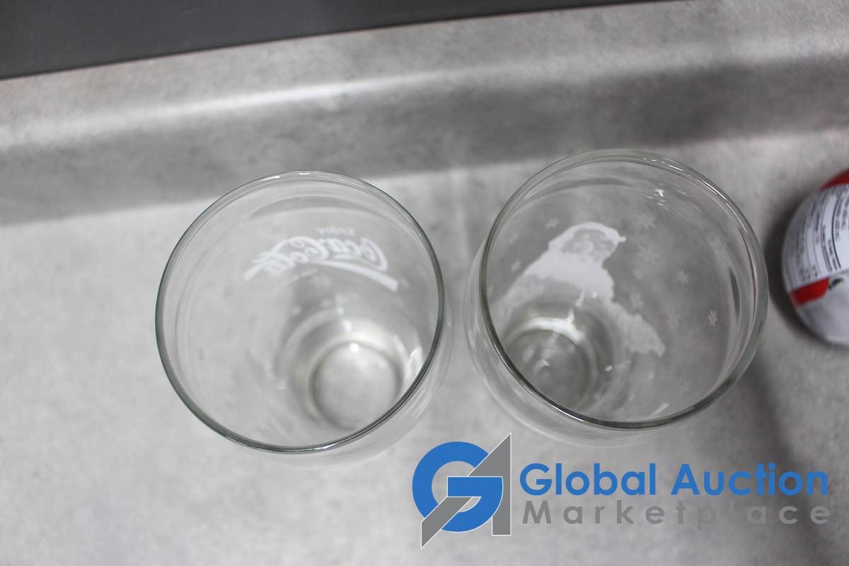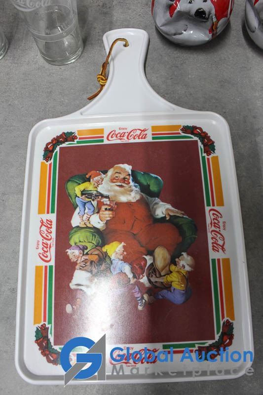 (2) Santa Coca Cola Glasses; (2) Bottles Coca Cola Holiday 2010 Balls w/Contents; Coca Cola Polar Bears Salt & Pepper Set; Santa Clause Coca Cola Cutting Board