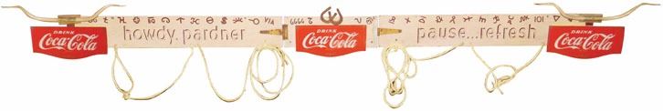 Coca Cola "Howdy Pardner" Festoon. Masonite and Wood. Very good condition. 105 X 15 including rope.