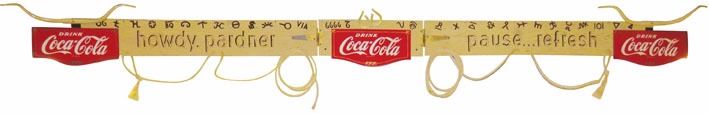 Coca Cola "Howdy Pardner" Festoon. Masonite and Wood. Good condition. 105 X 15 including rope.