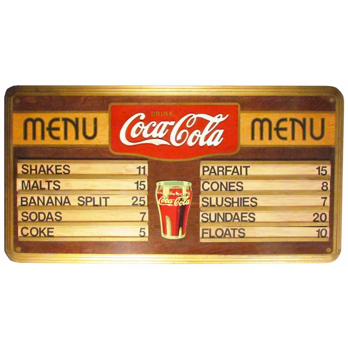 Coca Cola Kay-Display Menu Board. Complete with wood product/price inserts. Some damage on tail of logo otherwise excellent condition. 38 X 20 inches.