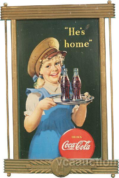 Coca Cola Lithograph Cardboard Sign In Original Embossed Coca Cola Frame c1944, "He's Home - Drink Coca Cola" - 16" x 27"