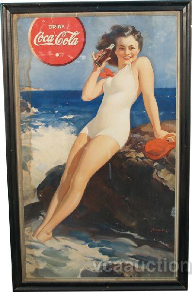 Coca Cola Lithograph Cardboard Sign c1948, "Drink Coca Cola" in wood frame - 29" x 50"