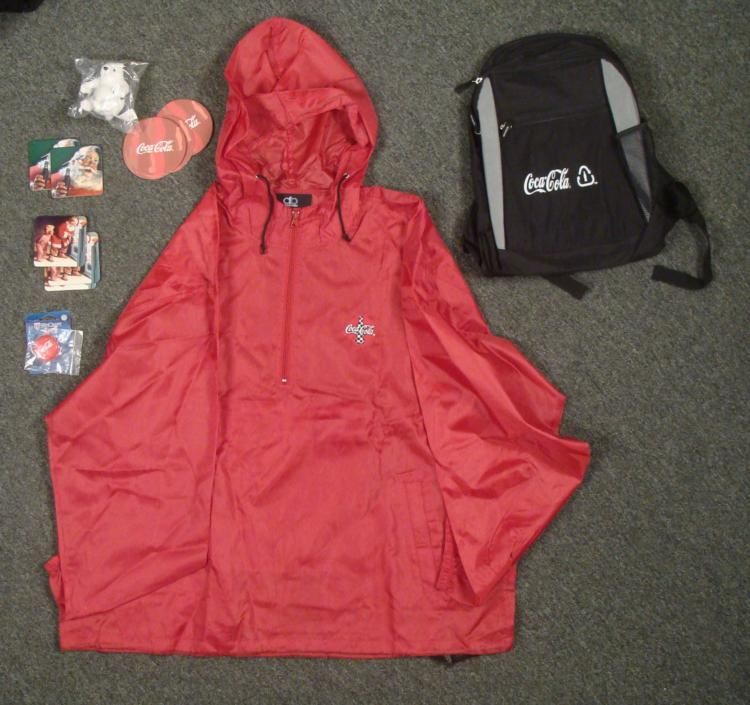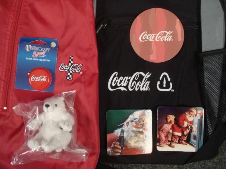 How else can you enjoy your favorite Coca-Cola products? Here's an excellent lot of seventeen Coke products that can get you going. * Twelve Coca Cola coasters: Seven coasters with Coca Cola bottles and five Christmas themed Two pins: One is red with the Coca Cola logo and the other is white and sponsored by the NFL XL, all-red, dunbrook, pull-over jacket with a racing flag Coca Cola bottle on the left chest Small, stuffed Coca Cola Polar Bear holding a coke bottle Black and gray Coca Cola backpackThere conditions range from very good to near mint. A perfect addition to your ever growing Coca Cola collection! * *