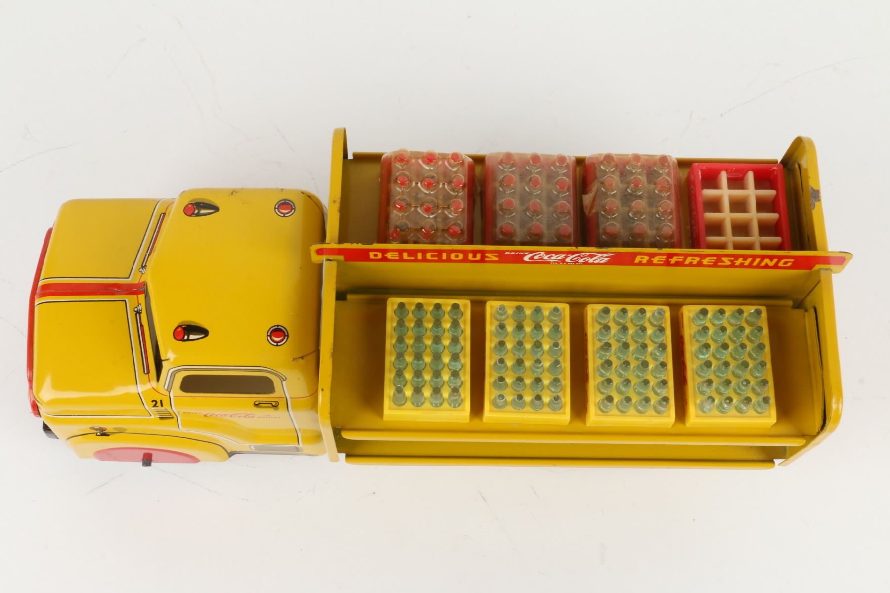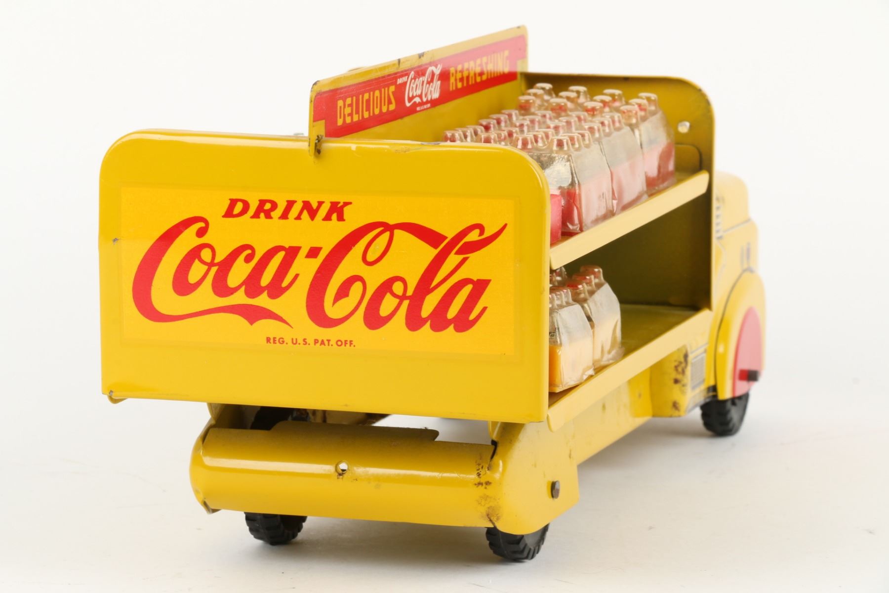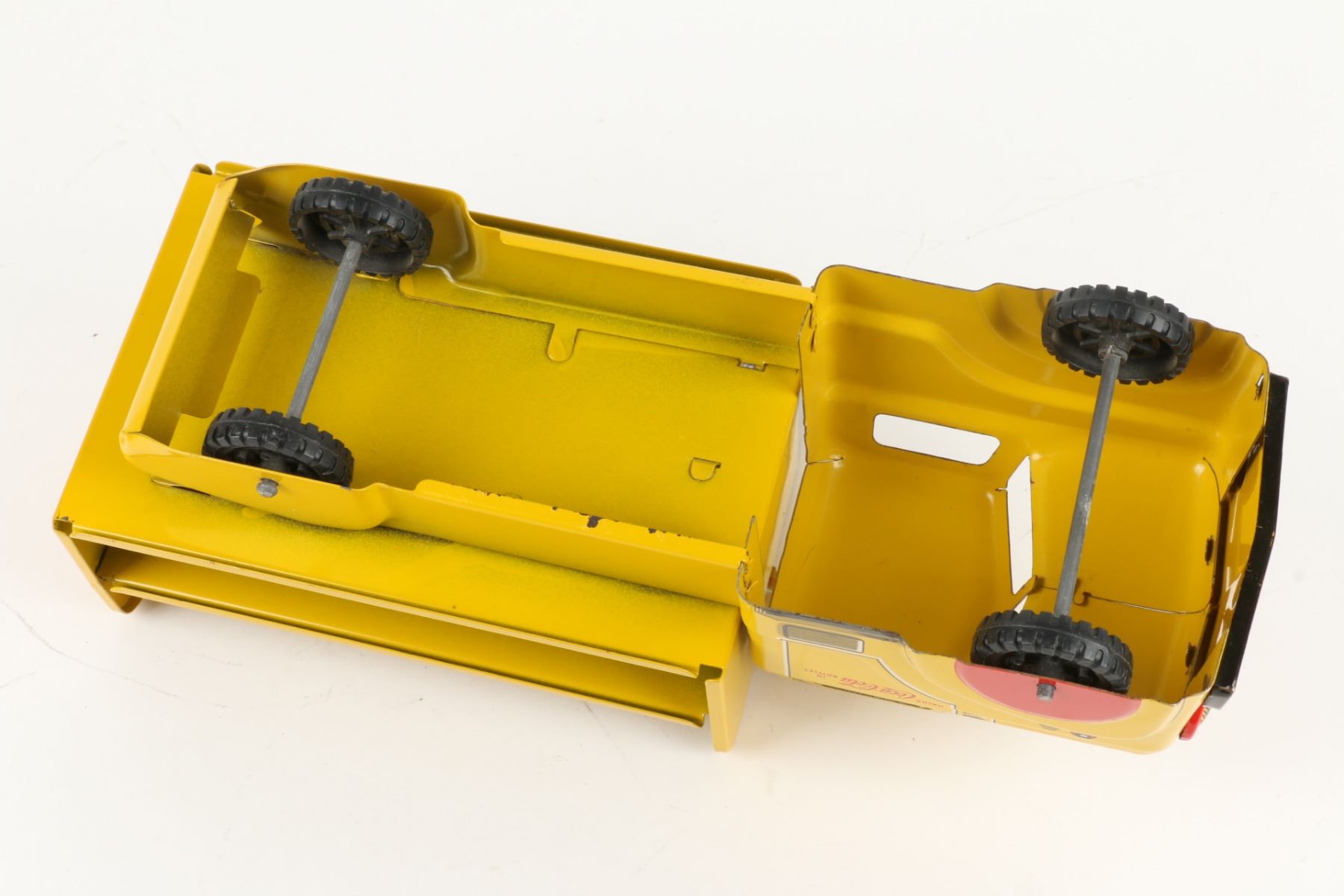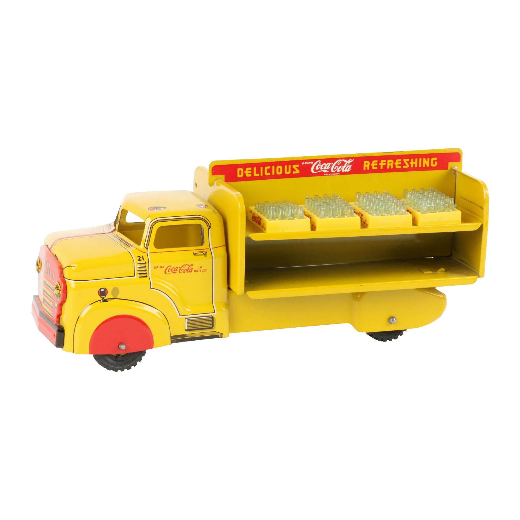 Circa 1954. Made by Louis Marx & Co., USA. Lithographed pressed steel. Includes 10 cases and original hand cart. 12.5" x 5" x 5". Very minor surface corrosion to passenger side door and a couple small paint chips. A very nice example. $300-500.