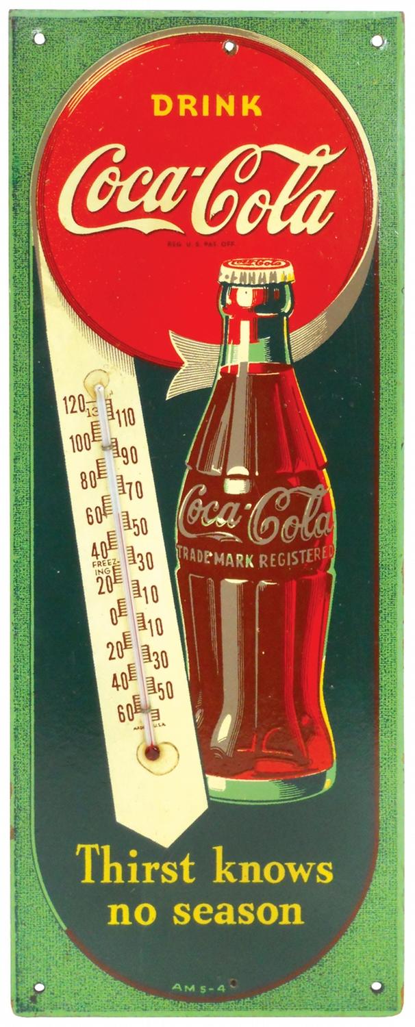 Coca-Cola Masonite thermometer, c.1944, complete w/orig thermometer, 2 additional mounting holes, o/wise Exc cond, 17"H x 7"W.