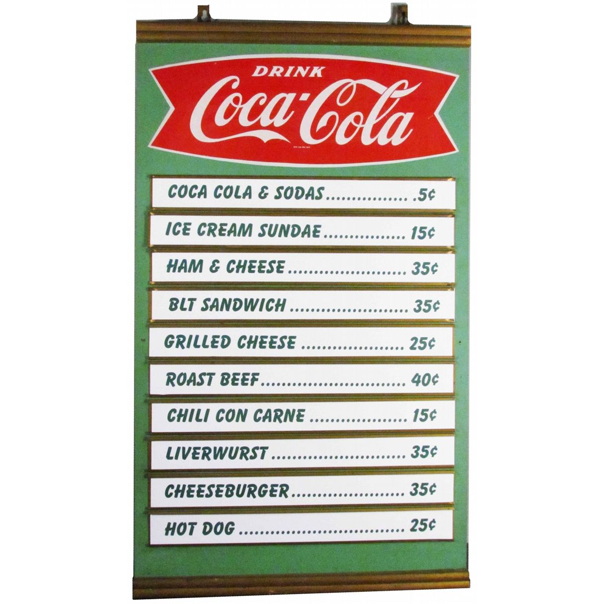 Coca Cola Menu Board with Fishtail Logo. Original paper inserts. Excellent condition. 17 1/2 X 39 1/2 inches.