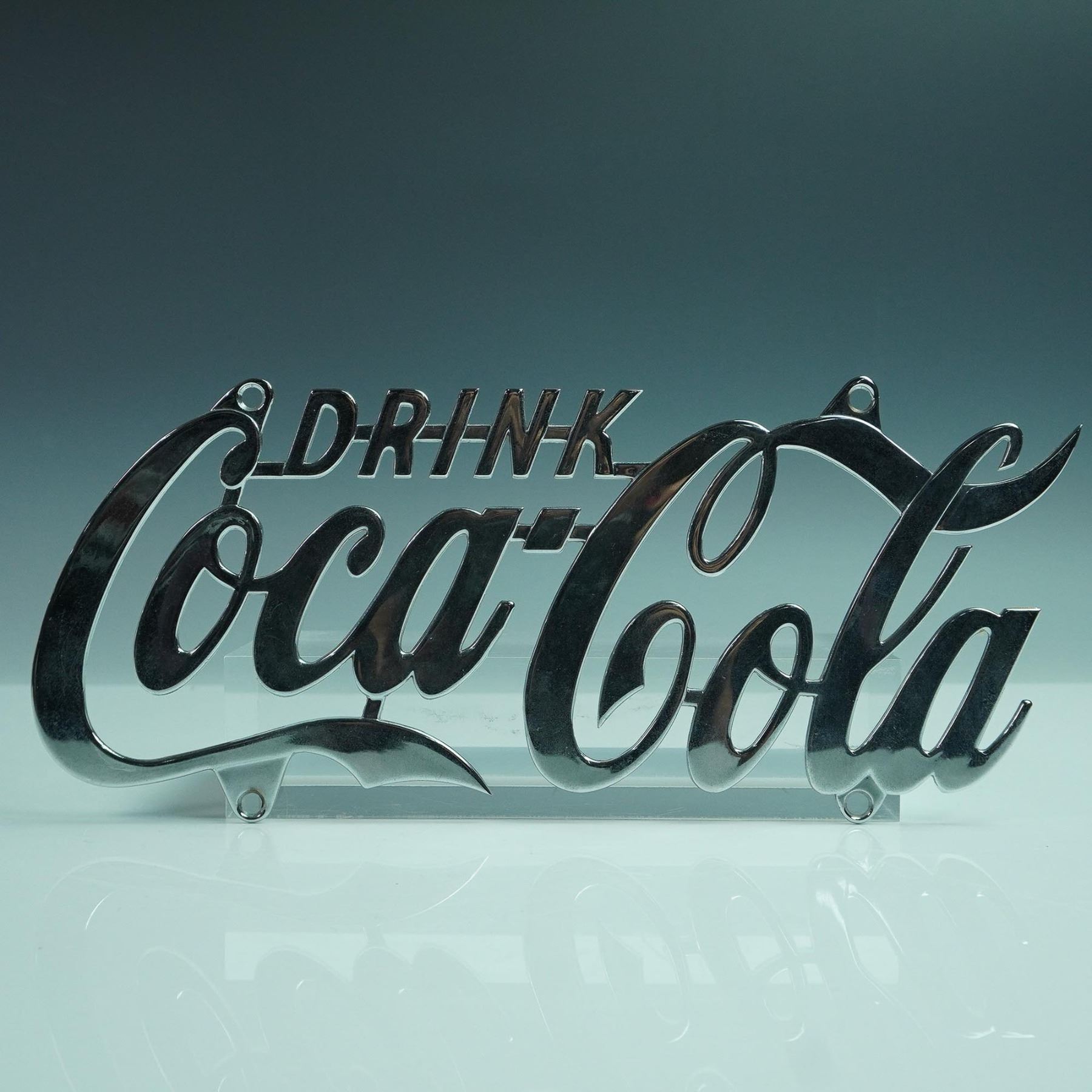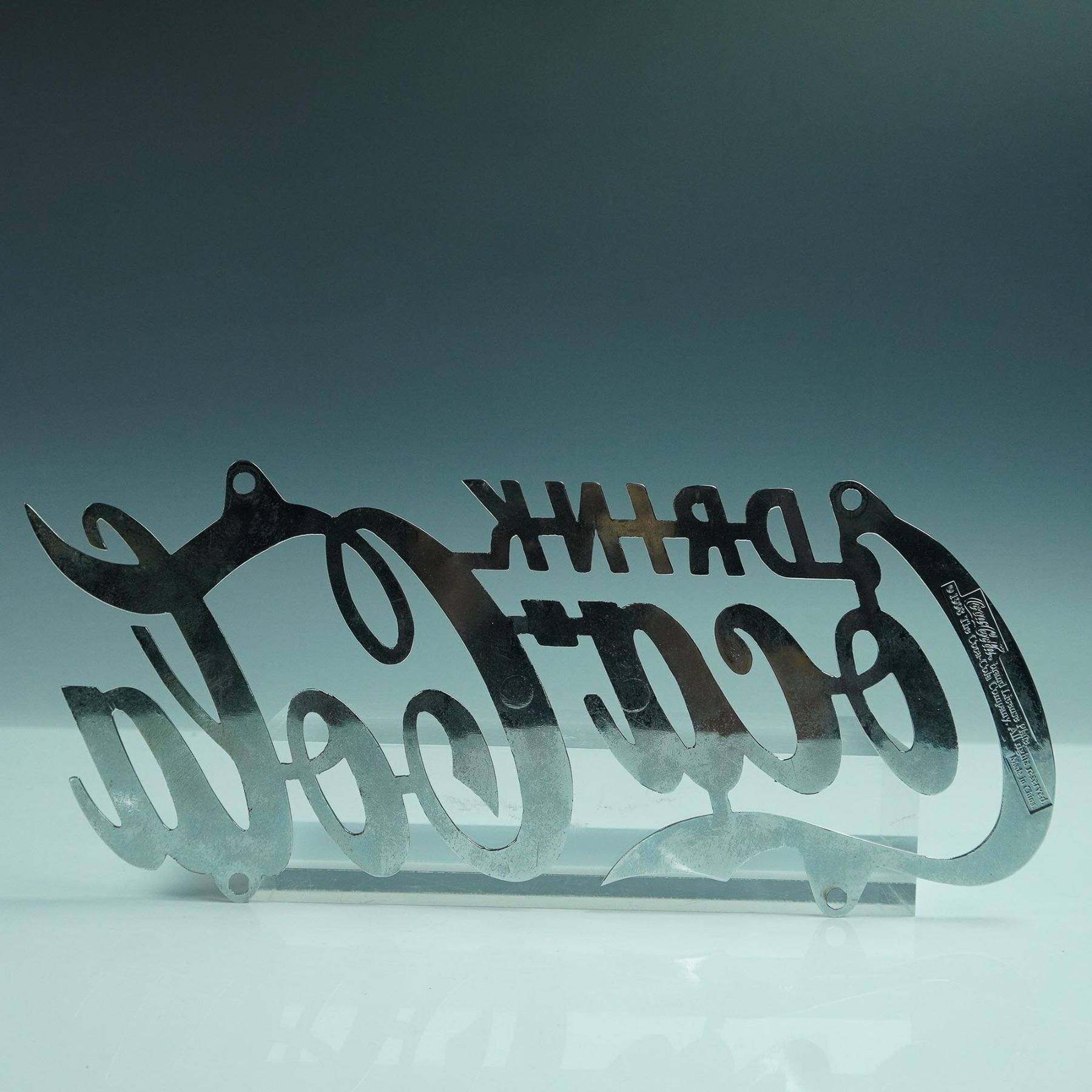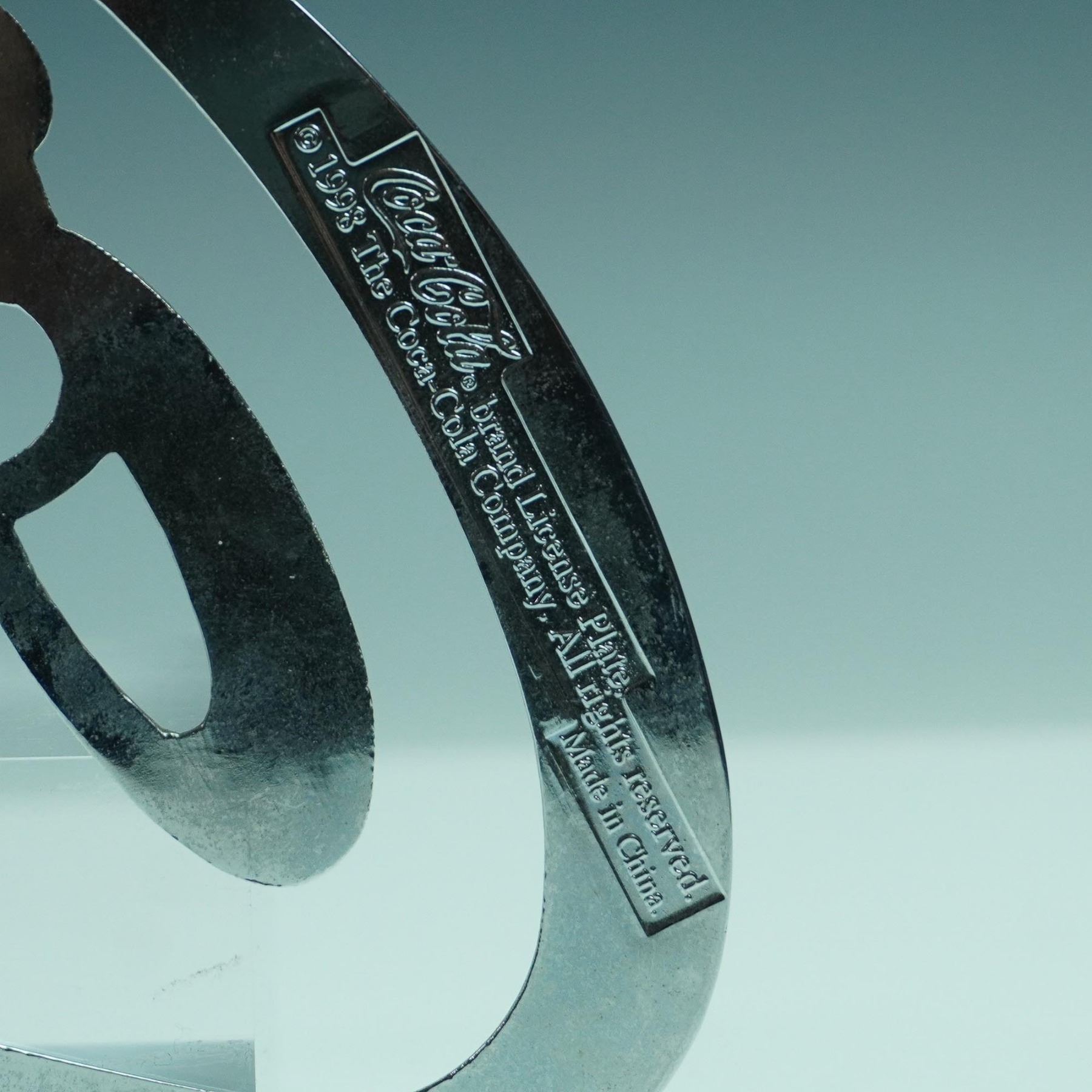 Coca-Cola metal license plate in a polished chrome-style finish. Dated 1998 and marked on the reverse with trademark and copyright information from The Coca-Cola Company, this piece is shaped to match the flowing contours of the iconic logo.