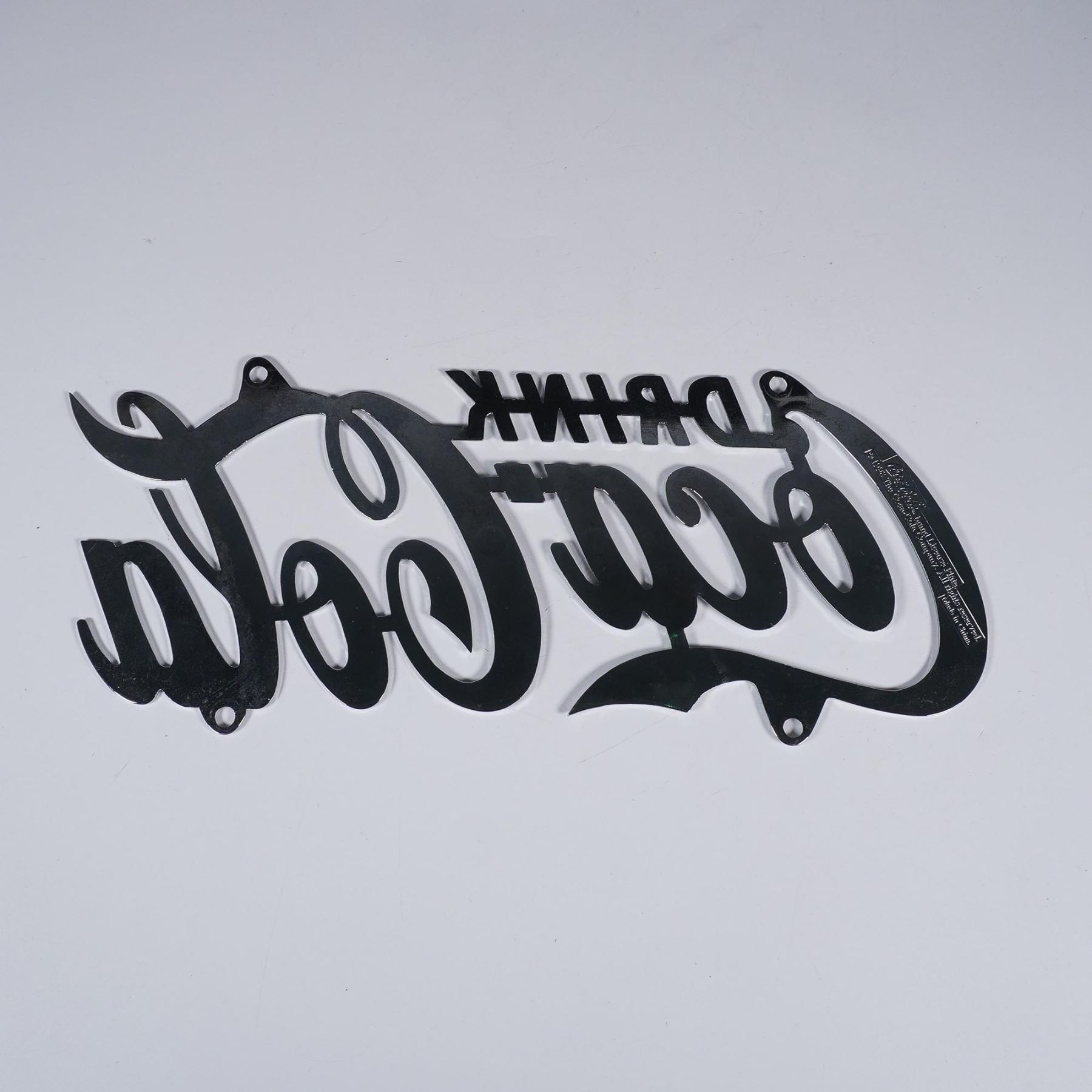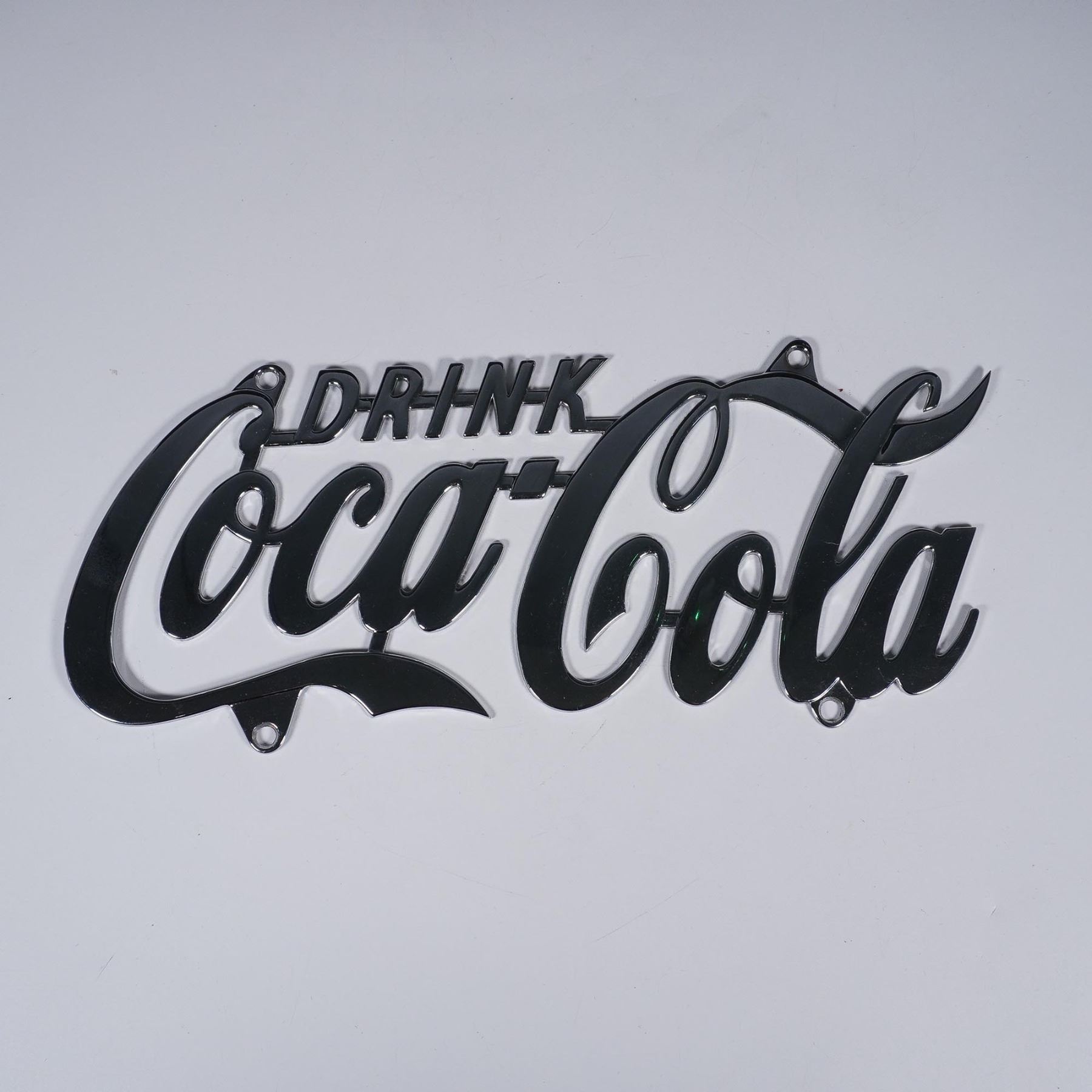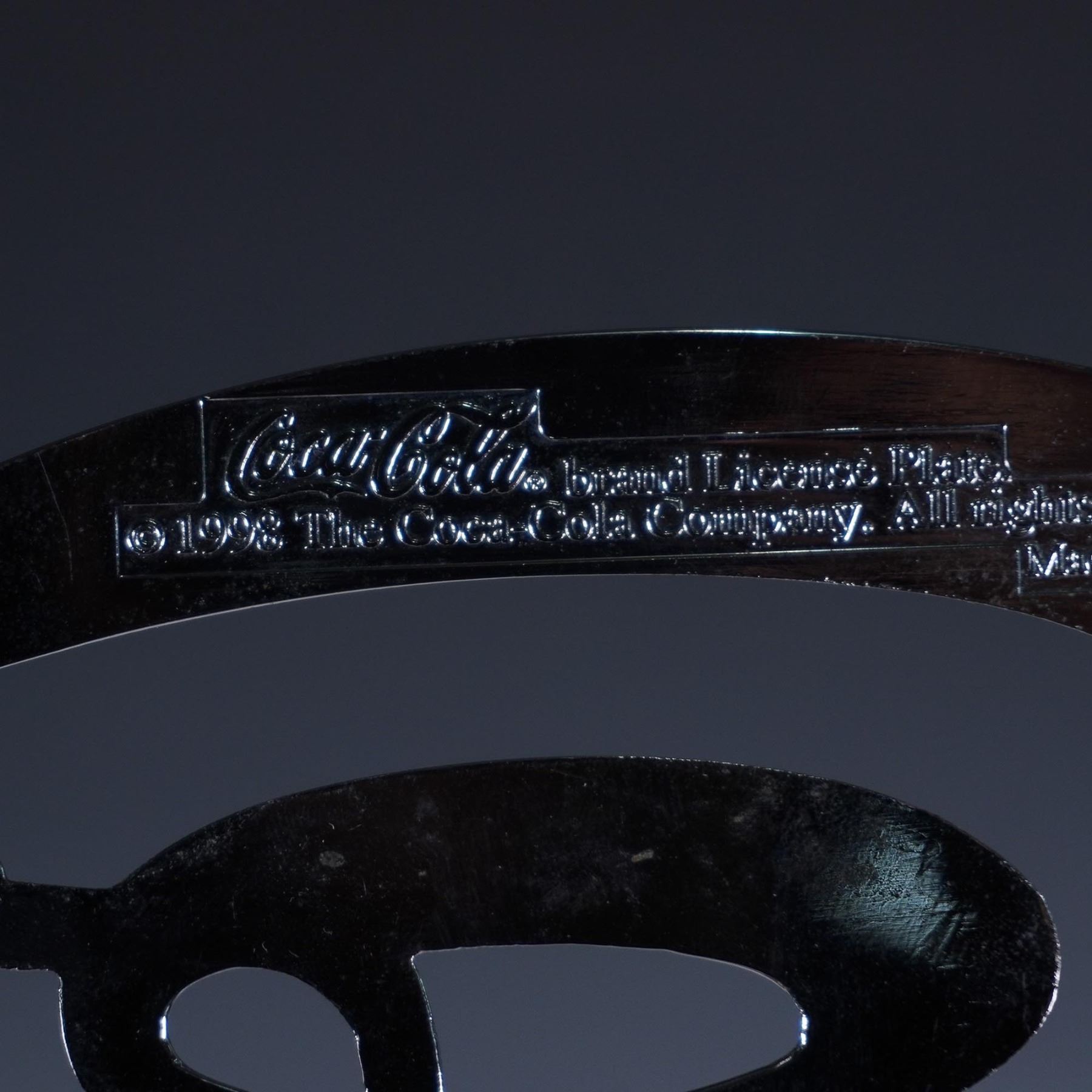 Coca-Cola metal license plate in a polished chrome-style finish. Dated 1998 and marked on the reverse with trademark and copyright information from The Coca-Cola Company, this piece is shaped to match the flowing contours of the iconic logo.