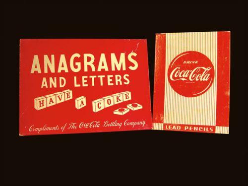 Coca Cola Misc Items, including box of anagrams and wood letters complete with instructions and empty Coca Cola pencil box.