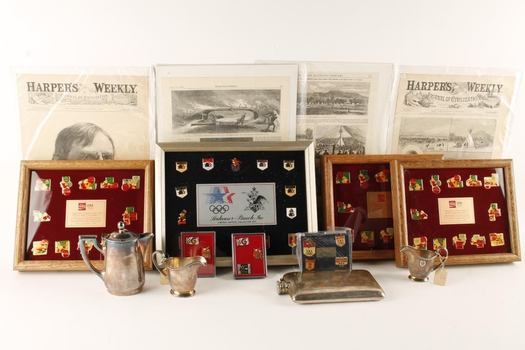 Coca Cola Pins, 3 sets of Santa Claus in boxes, Olympic pin set 4 pcs., 4 newspapers and advertisements, Harpers Weekly 1877, mostly Indian subjects back to 1866, 4 silver plated items, 1 hip flask Est.: $100-200