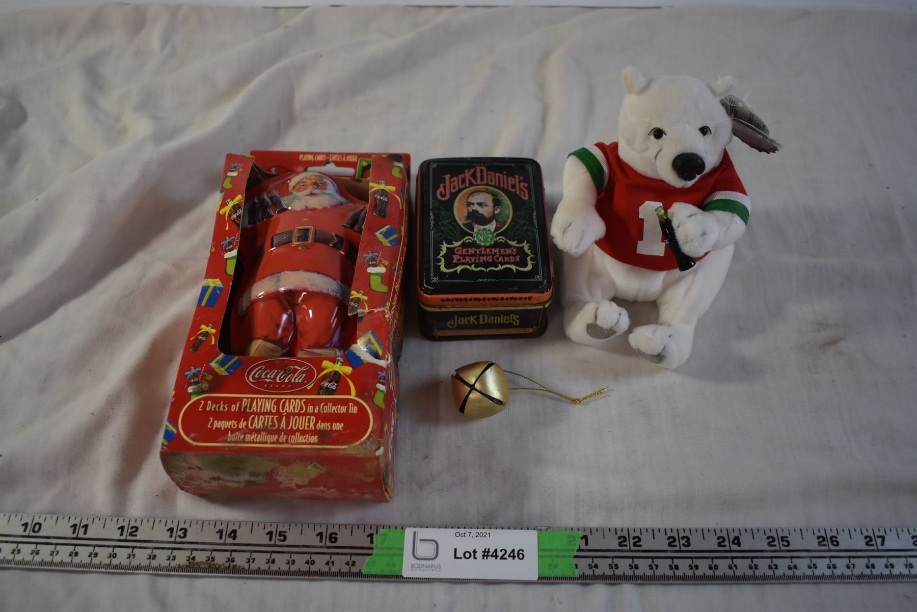 Coca-Cola Playing Cards in Tin, Coca-Cola Bear, Jack Daniels Tin and Bell