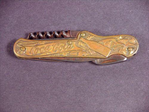 Coca Cola Pocket Knife/Corkscrew, brass grips, original. Very good original condition. 3 1/2 inches long.