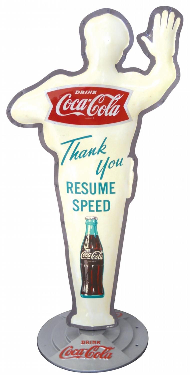 Coca-Cola Policeman School Crossing Guard sign, older 1950's version w/bottle logo on back, die cut metal w/embossed cast iron base, Exc cond w/minor restoration on edges, 62"H x 32"W.