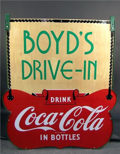 Coca-Cola porcelain 2 sided sign "Drive-in" 1950's 48" x 55" w/hangers
