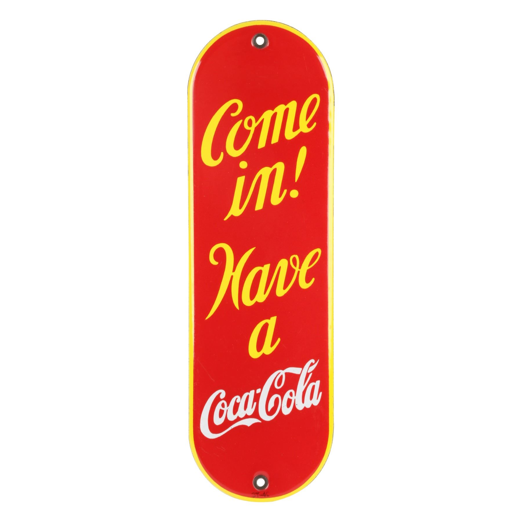 Canadian. Circa 1940. Made by St. Thomas Metal Signs Ltd., St. Thomas Ontario. Marked, "ST-40" lower edge. 11.75" x 3.5' Exceptional colour, gloss. No restoration. Note: This "Come In" version (intended for outside) was more prone to damage than the indoor "Thanks Call Again" version.