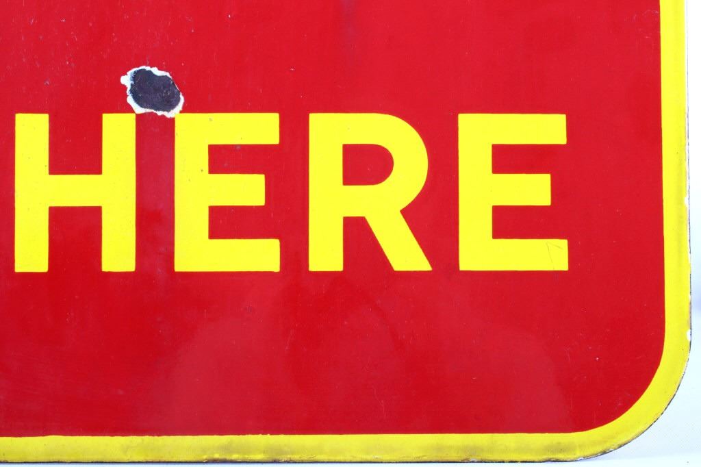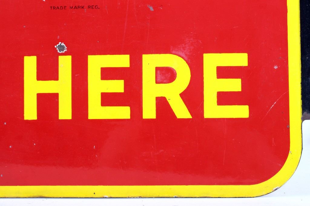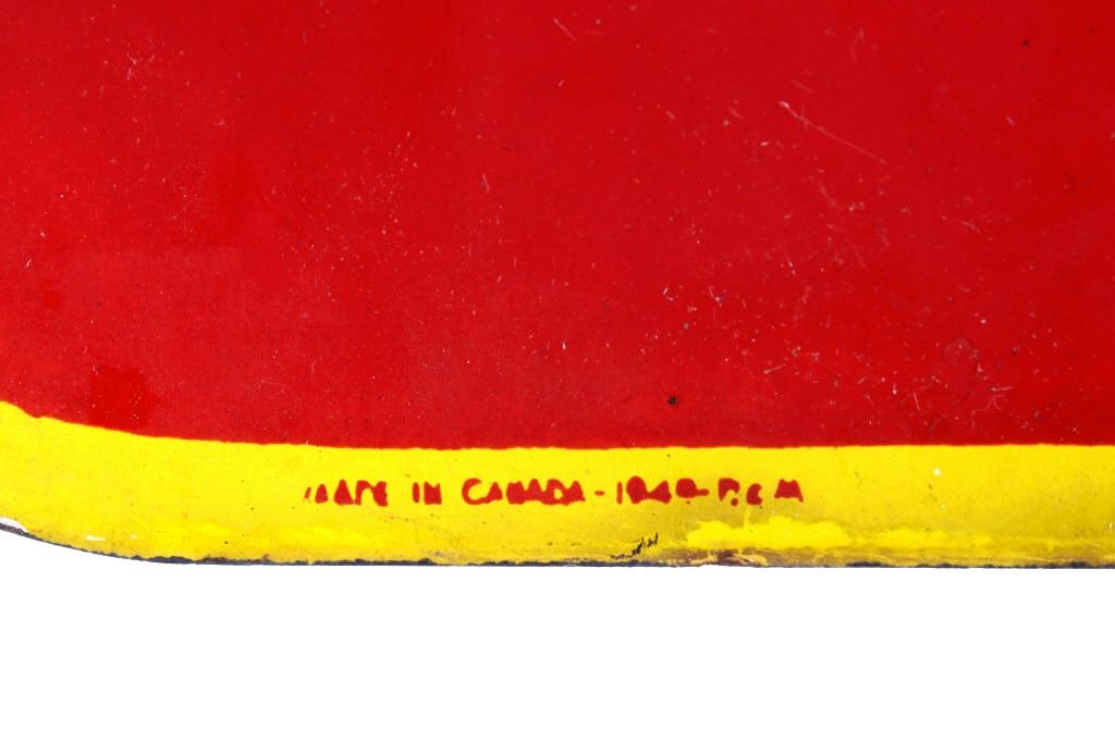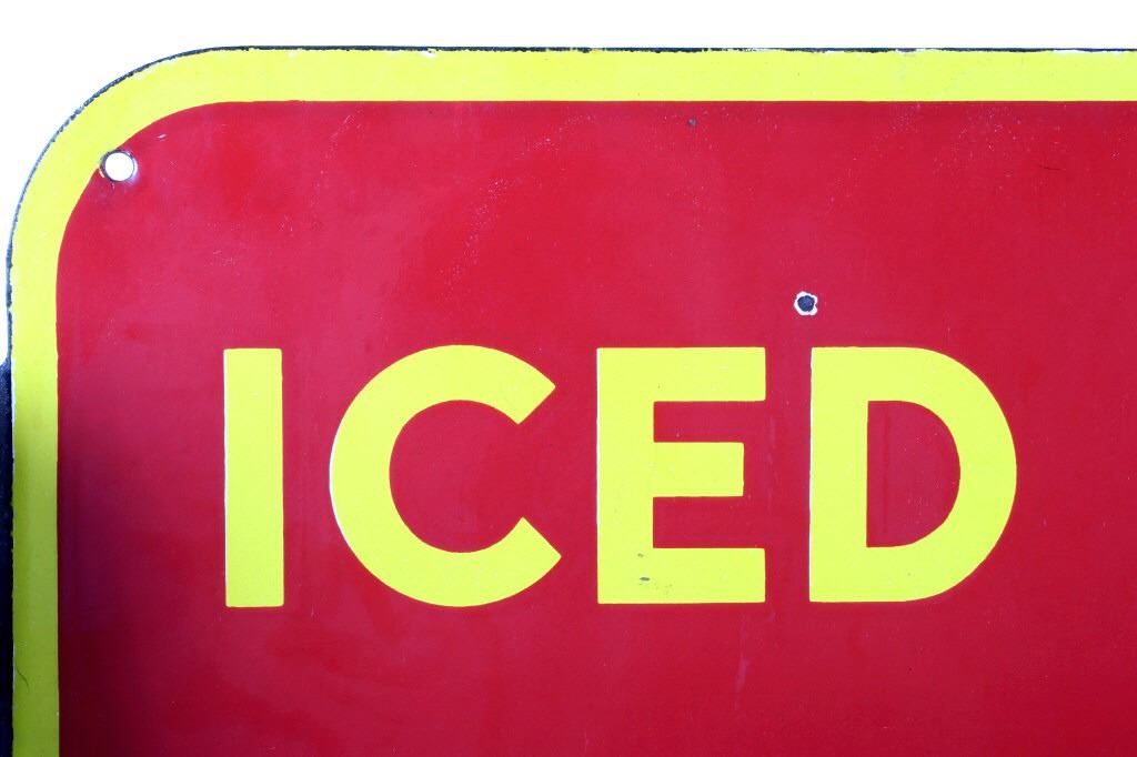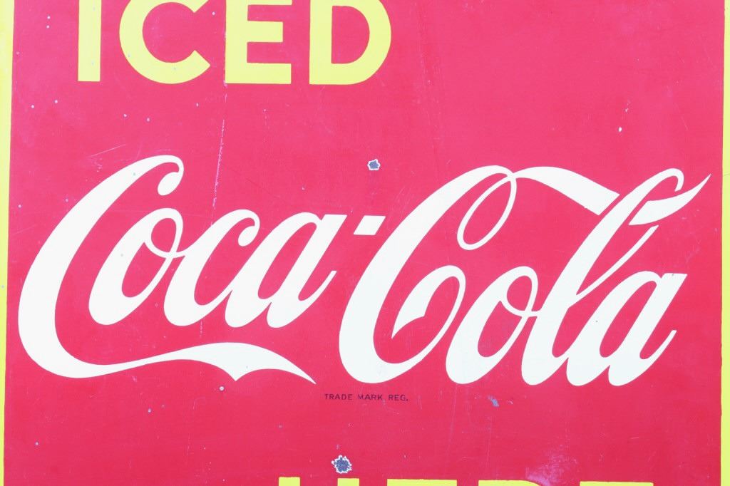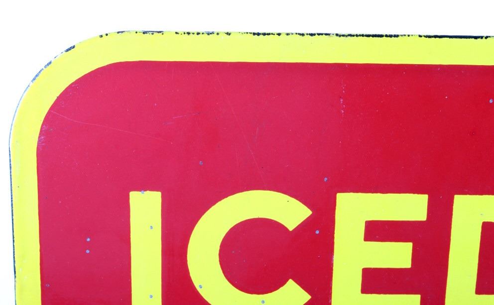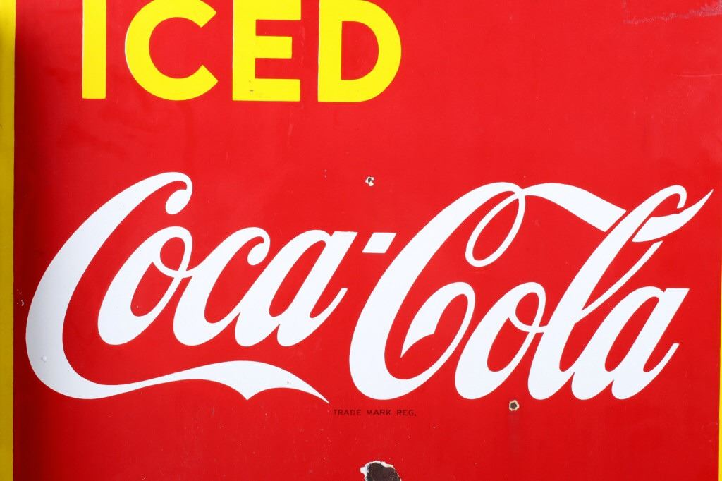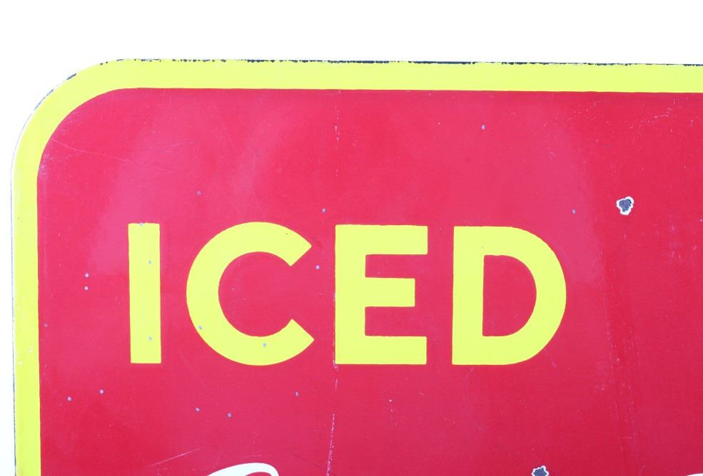 For your consideration is this circa 1948 Coca Cola Porcelain flange sign. The sign is red with a yellow border and yellow and white lettering; it reads "Iced Coca-Cola Here". "Coca-Cola" is in white while "Iced" and Here" are in yellow; the flange is black. The very bottom of the sign appears to read "Made in Canada 1948". The sign is in very good condition, with only small chips in the paint, the largest being about nickel size. The sign measures 17" W x 19.25" T and has a 1.75" x 13.5" flange.
