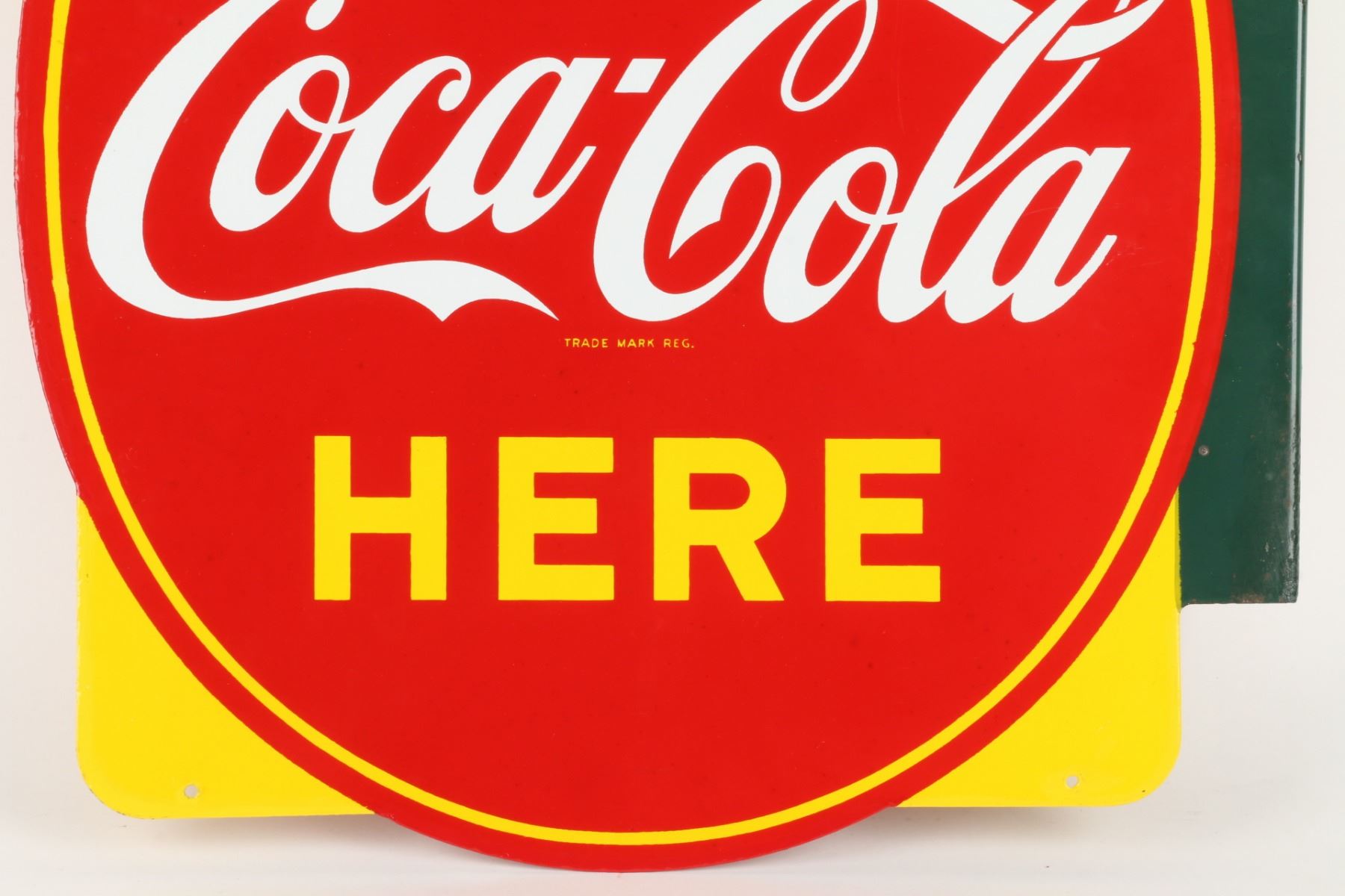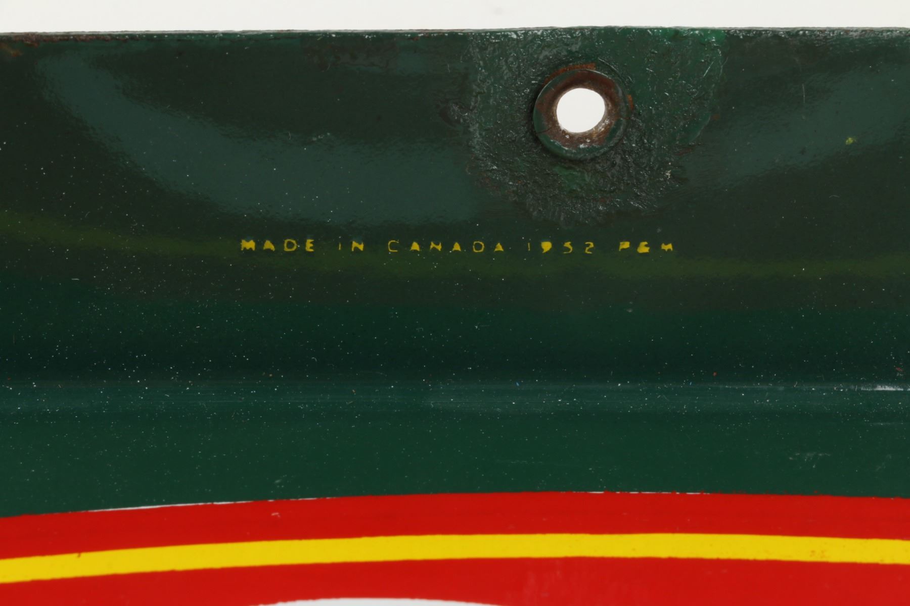Canadian. Circa 1960. Two-sided porcelain, wall-mounted flange. Marked, "Made in Canada 1952 P&M (Orillia)", inner flange. 20" x 18". Minor professional restoration to the outermost edge and flange. Just one very small field flake. All grommets in place. A very good example. $600-800.