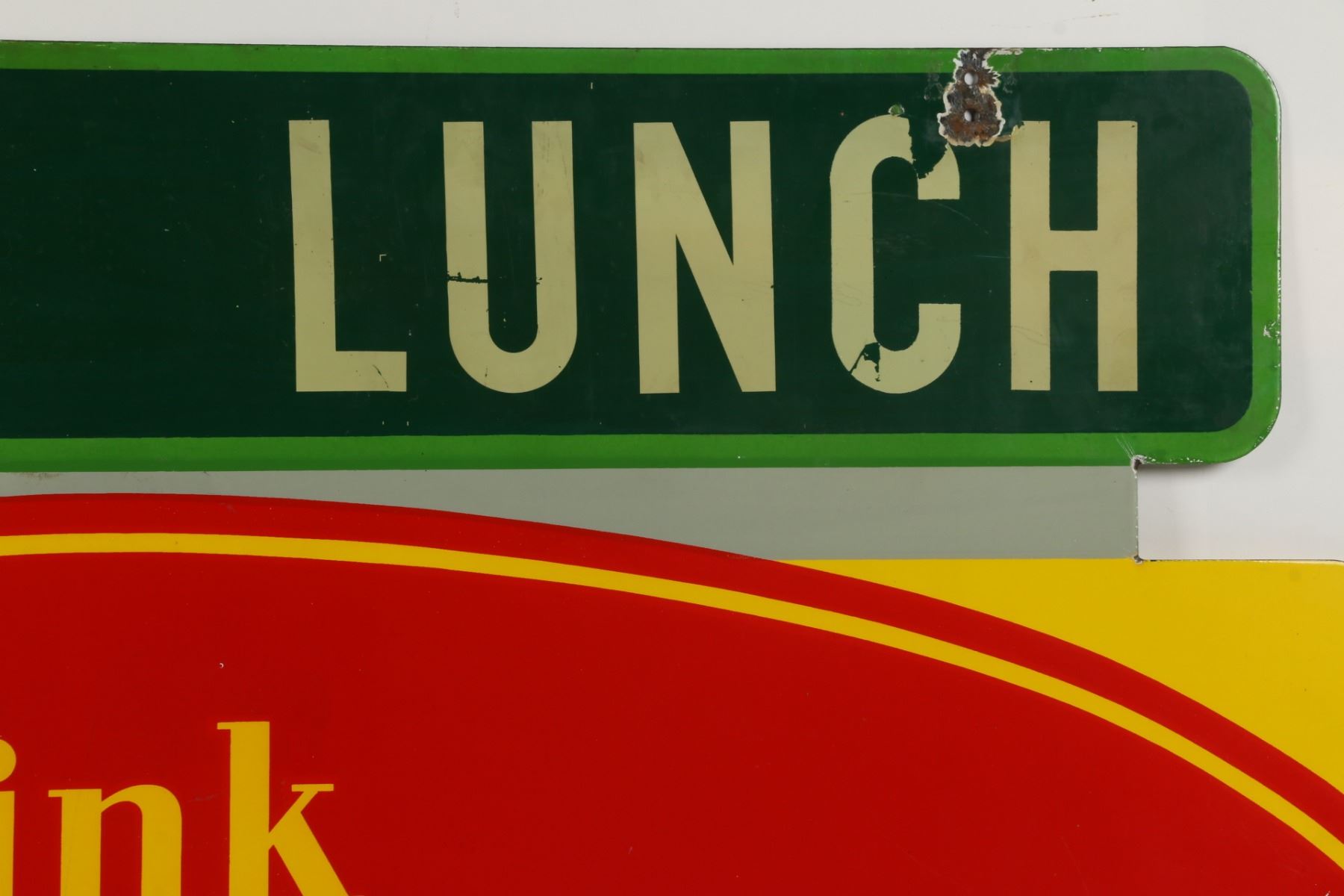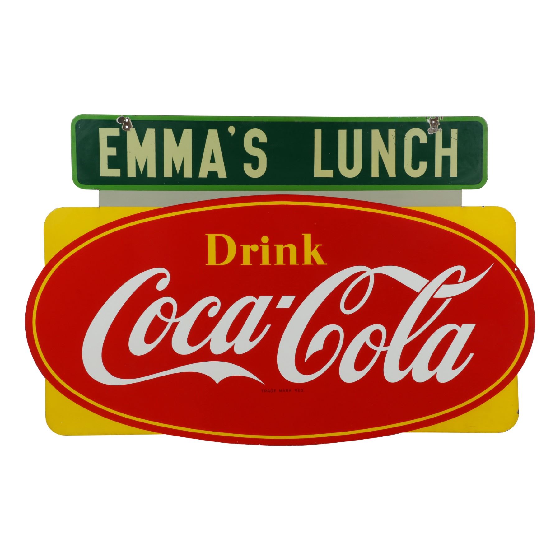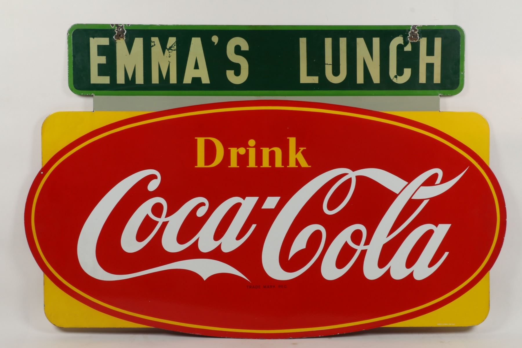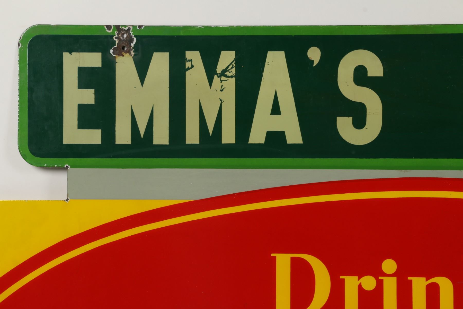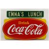 Canadian. Circa 1953. 2-sided porcelain. Marked, "Made in Canada, 1953 P&M (Orillia)", lower right edge of one side. "Emma's Lunch" privilege banner original and painted. From Brown's Beverages factory, Orillia, Ontario. 5' x 39". Minor chips surround hanging holes at upper edge. $1500-2000.