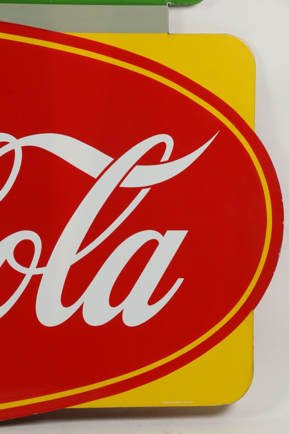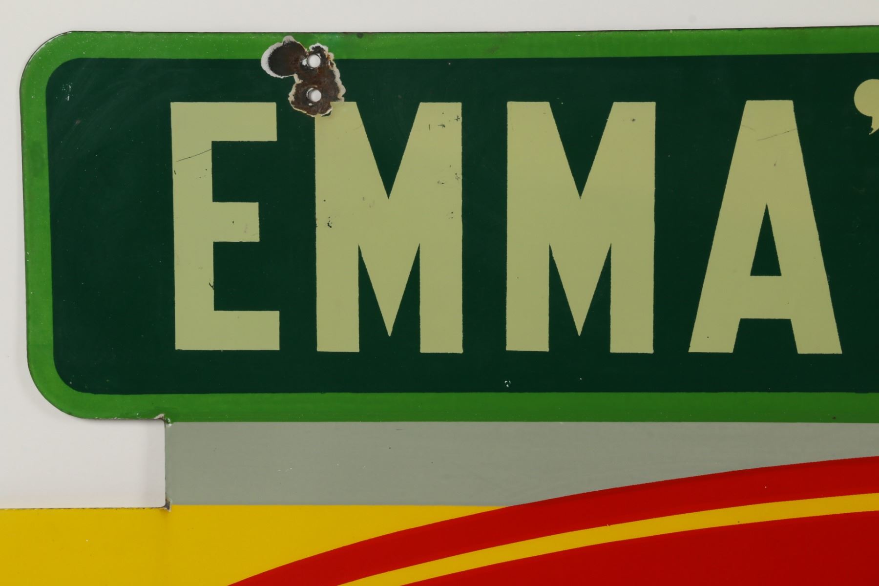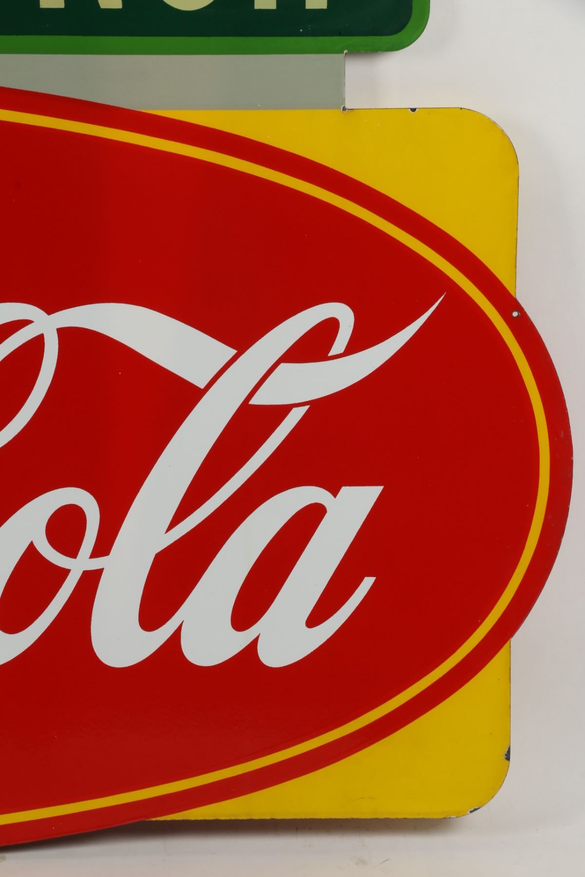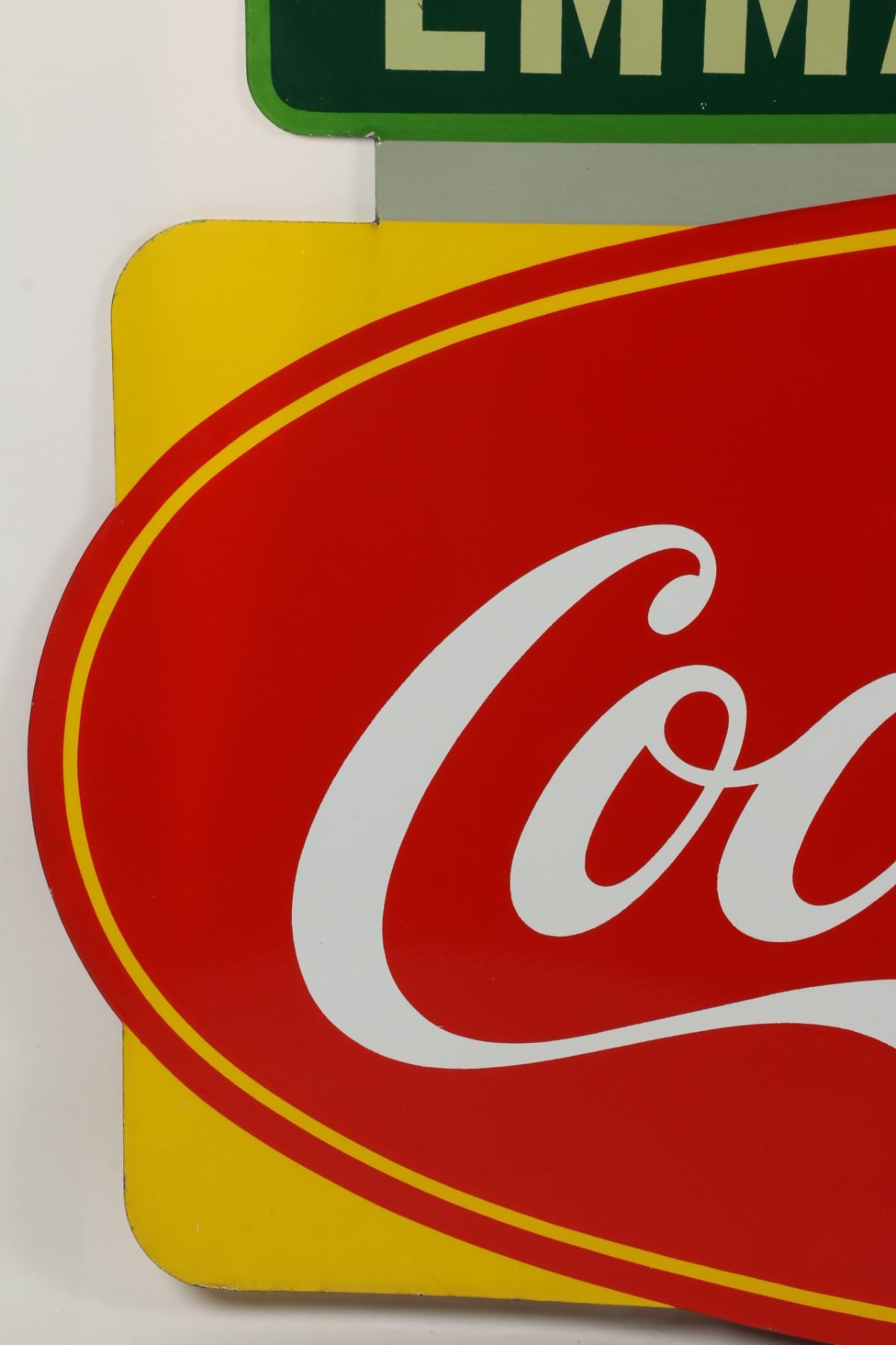 Canadian. Circa 1953. 2-sided porcelain. Marked, "Made in Canada, 1953 P&M (Orillia)", lower right edge of one side. "Emma's Lunch" privilege banner original and painted. From Brown's Beverages factory, Orillia, Ontario. 5' x 39". Minor chips surround hanging holes at upper edge. $1500-2000.