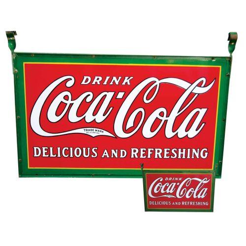 Coca Cola Porcelain Sign, two sided with original iron frame. Excellent condition. 5 foot X 3 foot.