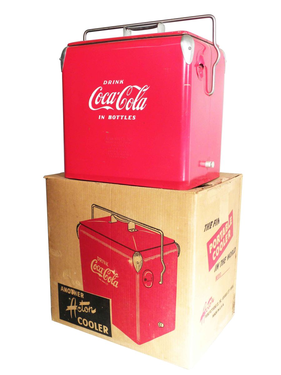 Coca Cola Portable Cooler in original box. By Acton Mfg Co. Arkansas City, KS. Both in excellent condition. 19 X 19 X 12 inches.