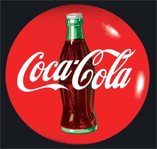 Coca Cola Red Button Sign. Minor chips at mounting hole otherwise excellent condition. 24 inch diameter.
