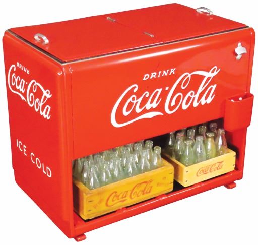Coca Cola Salesman Sample Cooler. Comes with two crates of bottles and two set of reproduction Sales Kit Cards. Cooler in near mint condition, complete with side opener and cap catcher. 12 X 10 1/2 X 7 1/2 inches.